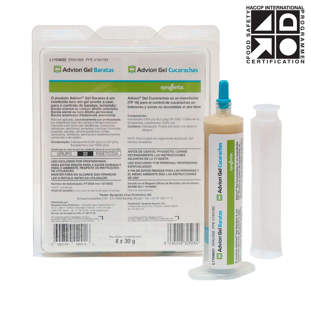 El Advion® Gel Cucarachas es un gel de gran efectividad gracias al ingrediente activo indoxacarb, para el control de todas las especies principales de cucarachas y pececillos de plata. El indoxacarb es el primer ingrediente activo en registrarse bajo la Directiva de Productos Biocidas. El indoxacarb una vez ingerido es transformado por el propio metabolismo de la cucaracha a una forma activa y produce la muerte de la cucaracha. Su mecanismo de actuación hace que tenga actividad secundaria y hasta terciaria sobre las cucarachas matando de esta manera a tanto adultos como ninfas que no han ingerido el producto directamente. Por cada cucaracha que consume Advion® Gel Cucarachas pueden morir otras 50 adicionales incluyendo esas ninfas que permanecen escondidas en sus refugios sin salir a comer.