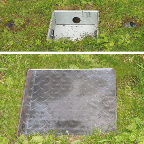Caja portacebos fabricada en acero diseñada para enterrarse bajo tierra y con una tapa que asemeja la de una alcantarilla. Se puede simular un suelo natural para estimular a los roedores a que entren y se alimenten. Dispone de hasta 4 puntos de entrada o vías de escape para los roedores neofóbicos y nerviosos. Con barras de sujeción para bloques de cebo. Se puede sujetar la caja al suelo con fijaciones o con cemento. Segura, con cerrojo de tornillo.
