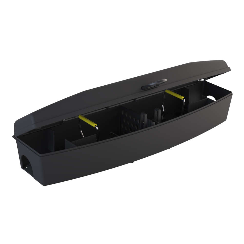 Separador central transparente con perforaciones que proporciona una línea de visión continua a lo largo de la caja de extremo a extremo. Dos ranuras de inspección en la parte superior que permiten ver sin abrir la caja si los cepos se han activado, para unas inspecciones más rápidas. La tapa extraíble permite un acceso fácil para limpiar la estación de captura.