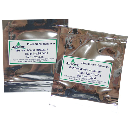 Efectivo atrayente para monitorear un amplio rango de escarabajos de los productos almacenados. Para la captura de Sitophilus spp., Oryzaephilus spp., Rhyzopertha dominica, Cryptolestes spp. y Tribolium spp. (escarabajos de la harina). Atrayente alimenticio, impregnado en un soporte de espuma, para ser usado en trampas pegajosas o similares.