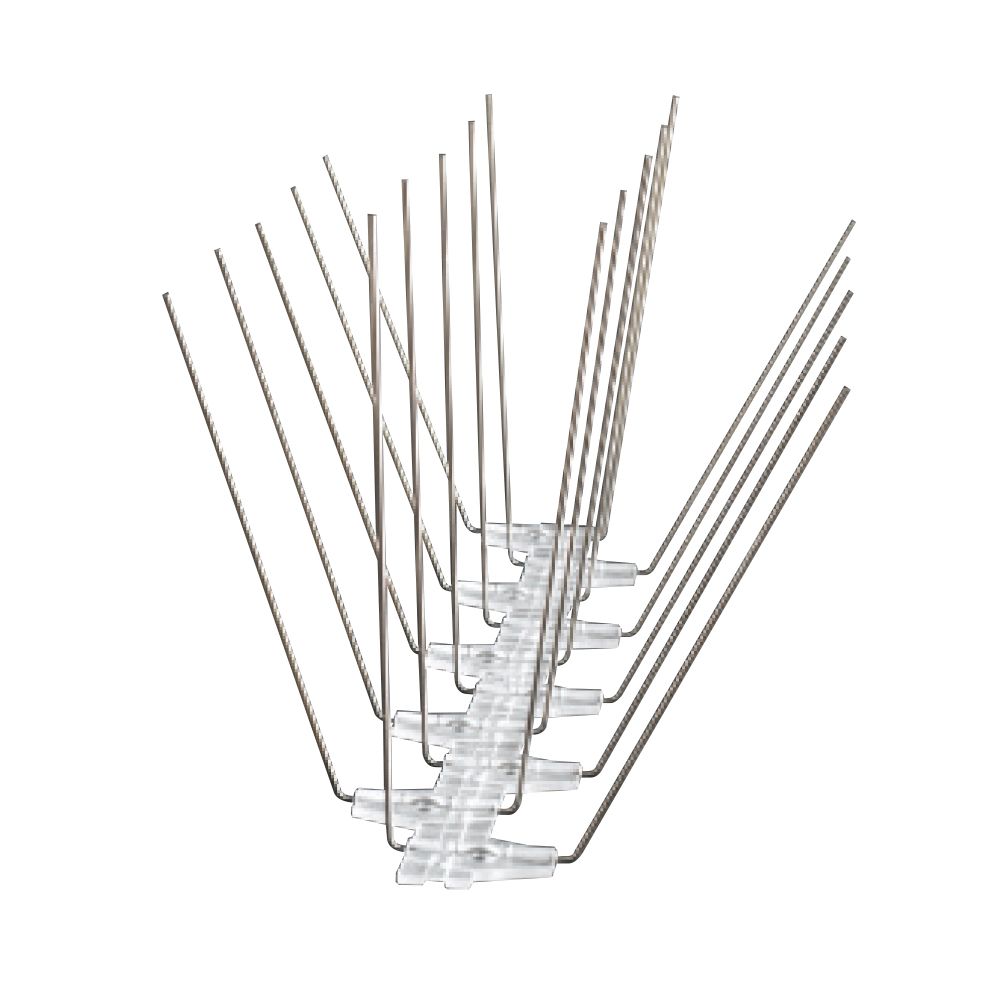 Pinchos para palomas con mayor densidad de púas, base más ancha de 45mm y en tiras de 33cm. La punta de las púas están separadas 140mm pudiendo proteger un área de hasta 265mm de anchura. La base es de policarbonato protegido contra la luz ultravioleta y los pinchos de acero inoxidable con la punta roma.