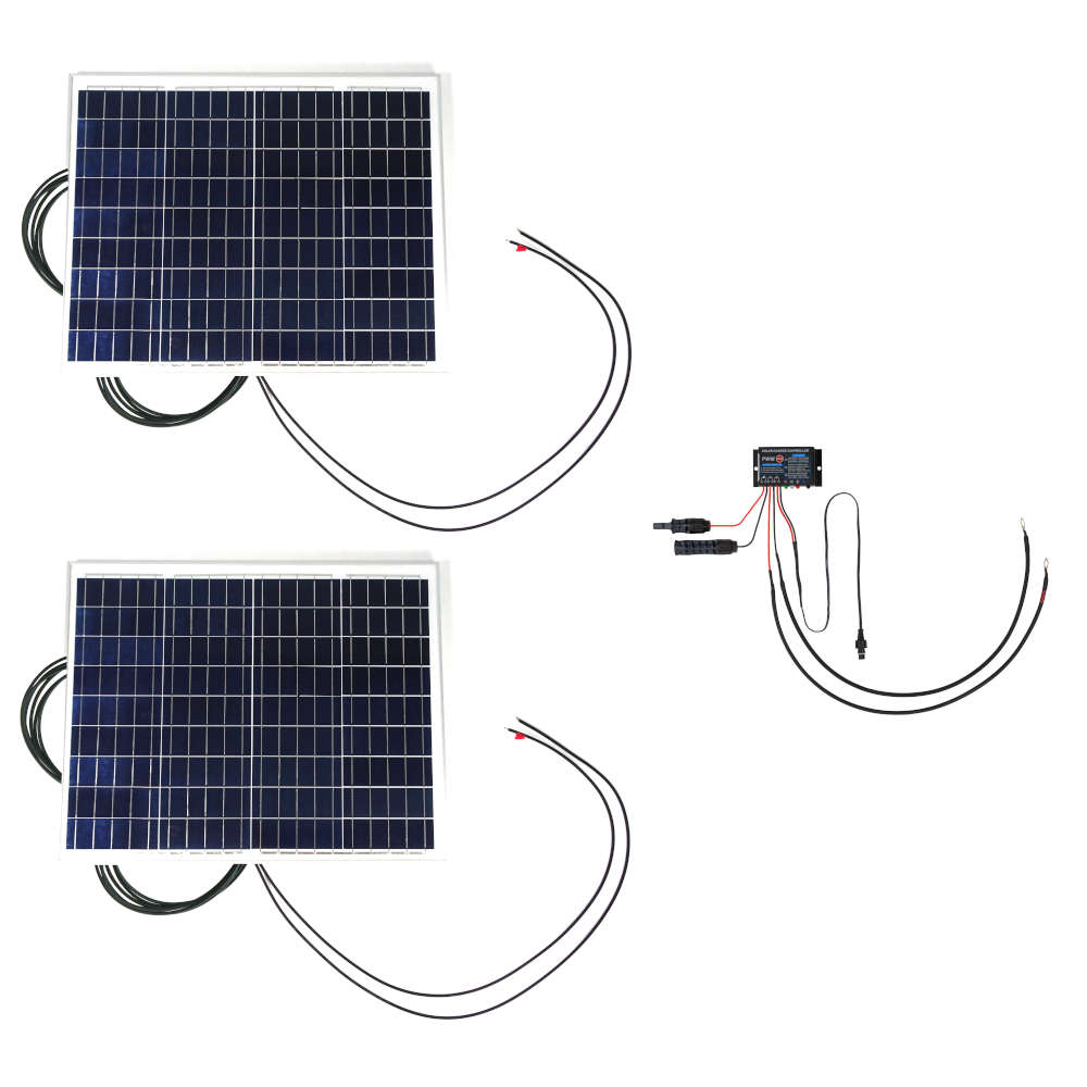 Para lugares remotos sin acceso a corriente eléctrica, opción de kit solar que incluye dos placas solares de 50W de 12V con su correspondiente controlador de carga. No se incluye la batería de 12V que se recomienda que sea de 70-90Ah.