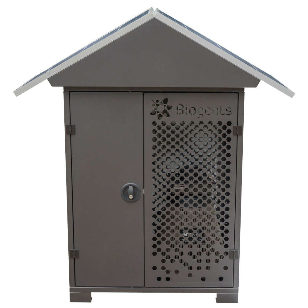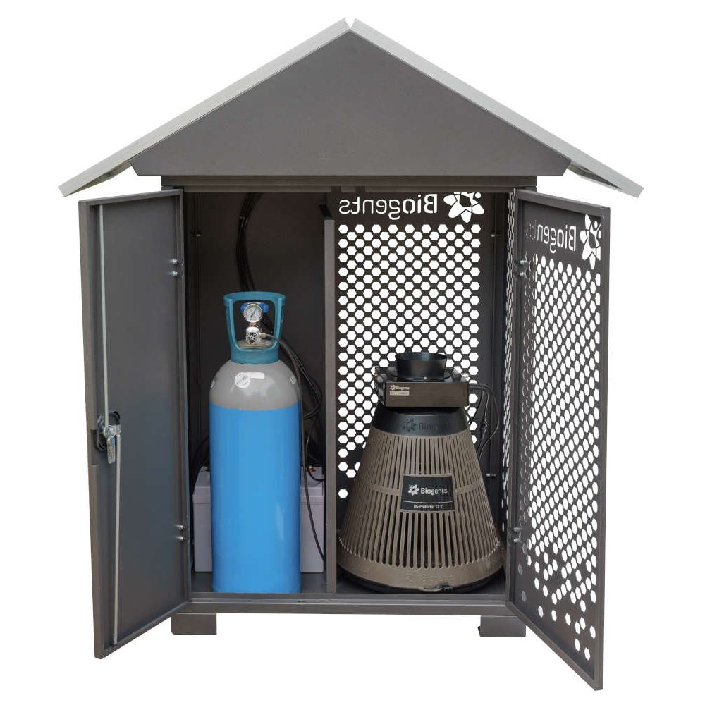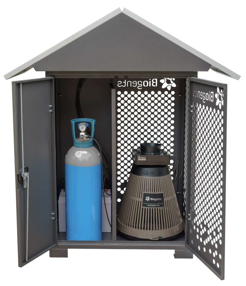 Caja protectora de metal para evitar el vandalismo. Especialmente diseñada para la trampa BG-Protector. Dos compartimentos, espacio suficiente para colocar una botella de CO2 y una batería. El techo está adaptado para la instalación del kit de placas solares Biogents, para instalaciones en ubicaciones que no disponen de una toma de corriente eléctrica.