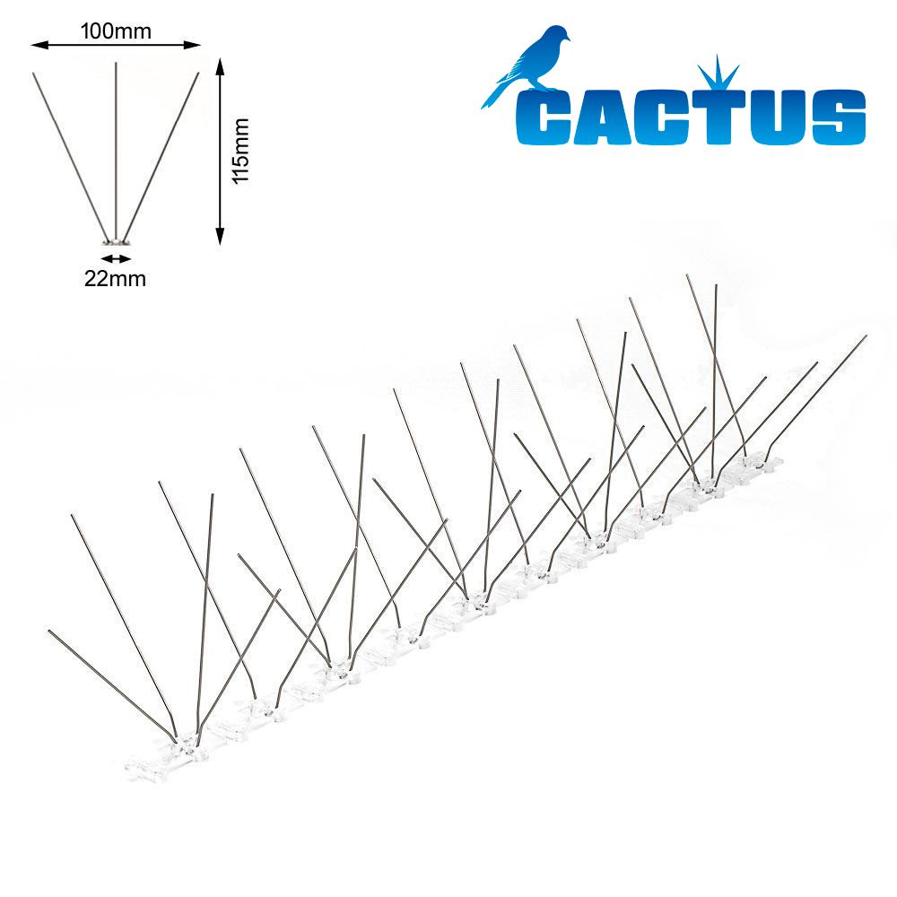 Pinchos para la protección de superficies frente a las palomas de 10cm de anchura y en tiras de 50cm de longitud. La base es de policarbonato protegido contra la luz ultravioleta y las púas de acero inoxidable con la punta roma. Los pinchos se pueden instalar en cualquier tipo de superficie mediante una silicona adecuada. La base es plana en su parte inferior para facilitar la aplicación de la silicona, tiene líneas de fragmentación que permiten recortar fácilmente la longitud del pincho y agujeros para el montaje mediante tornillos.