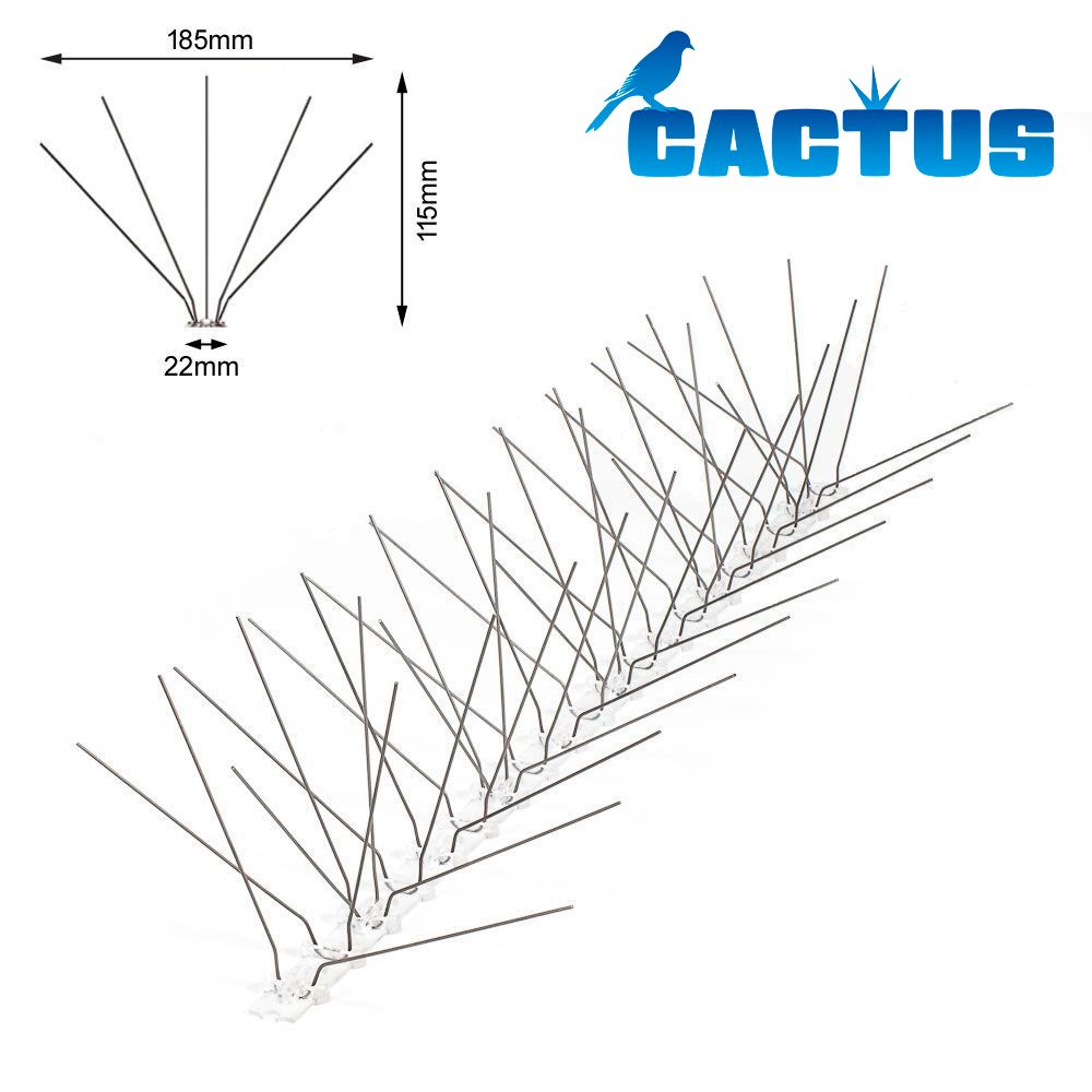 Pinchos para la protección de superficies frente a las palomas de 18,5cm de anchura y en tiras de 50cm de longitud. La base es de policarbonato protegido contra la luz ultravioleta y las púas de acero inoxidable con la punta roma. Los pinchos se pueden instalar en cualquier tipo de superficie mediante una silicona adecuada. La base es plana en su parte inferior para facilitar la aplicación de la silicona, tiene líneas de fragmentación que permiten recortar fácilmente la longitud del pincho y agujeros para el montaje mediante tornillos.