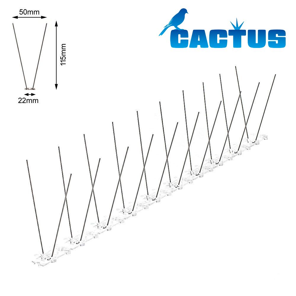 Pinchos para la protección de superficies frente a las palomas de 5cm de anchura y en tiras de 50cm de longitud. La base es de policarbonato protegido contra la luz ultravioleta y las púas de acero inoxidable con la punta roma. Los pinchos se pueden instalar en cualquier tipo de superficie mediante una silicona adecuada. La base es plana en su parte inferior para facilitar la aplicación de la silicona, tiene líneas de fragmentación que permiten recortar fácilmente la longitud del pincho y agujeros para el montaje mediante tornillos.