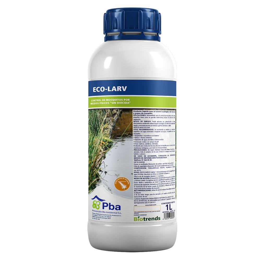 El Eco-Larv es un producto líquido no biocida a base de silicona para el control de larvas de mosquitos en aguas estancadas. Se aplica al agua donde se crían los mosquitos y éste se extiende en toda la superficie formando una película que impide la respiración de las larvas y pupas. Por su modo de acción mecánica controla todas las fases larvarias y las pupas de los mosquitos, afecta a la oviposición.