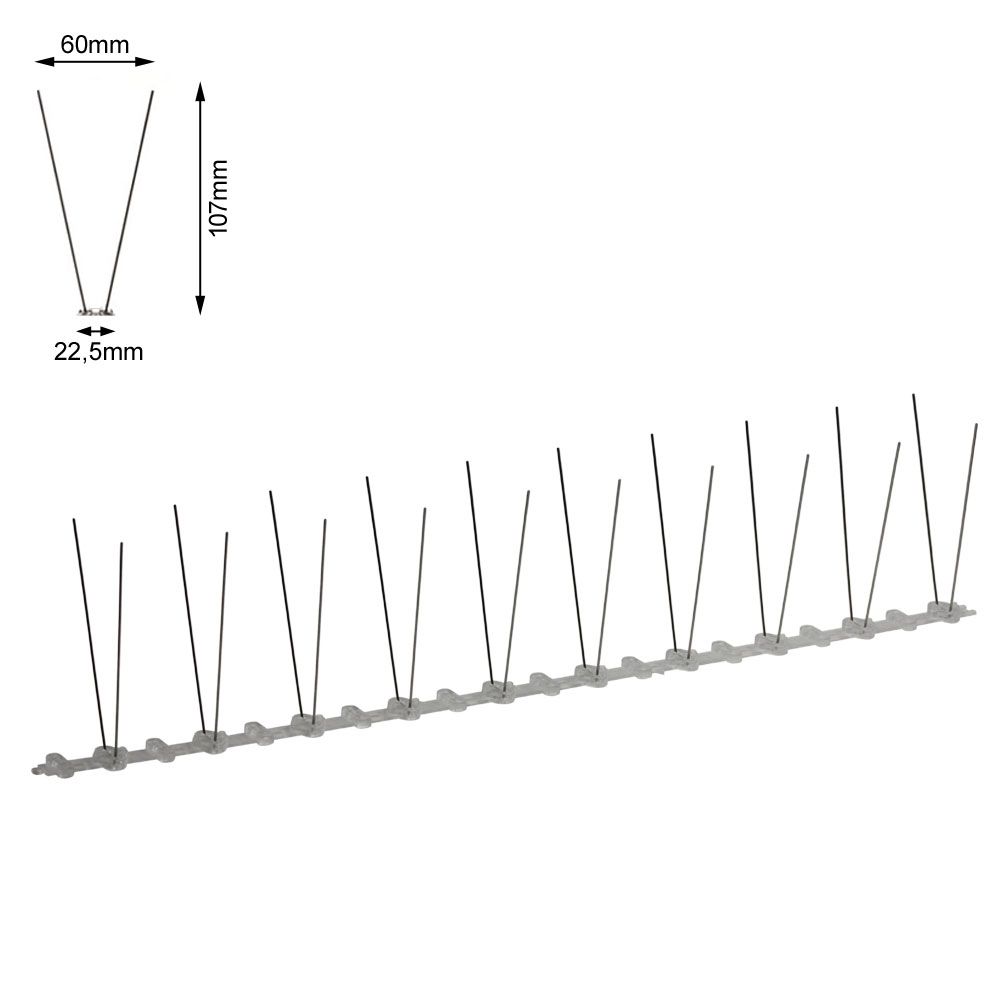 Pinchos para la protección de superficies frente a las palomas de 6cm de anchura y en tiras de 50cm de longitud. La base es de policarbonato protegido contra la luz ultravioleta y las púas de acero inoxidable con la punta roma. Los pinchos se pueden instalar en cualquier tipo de superficie mediante una silicona adecuada. La base es plana en su parte inferior para facilitar la aplicación de la silicona, tiene líneas de fragmentación que permiten recortar fácilmente la longitud del pincho y agujeros para el montaje mediante tornillos.