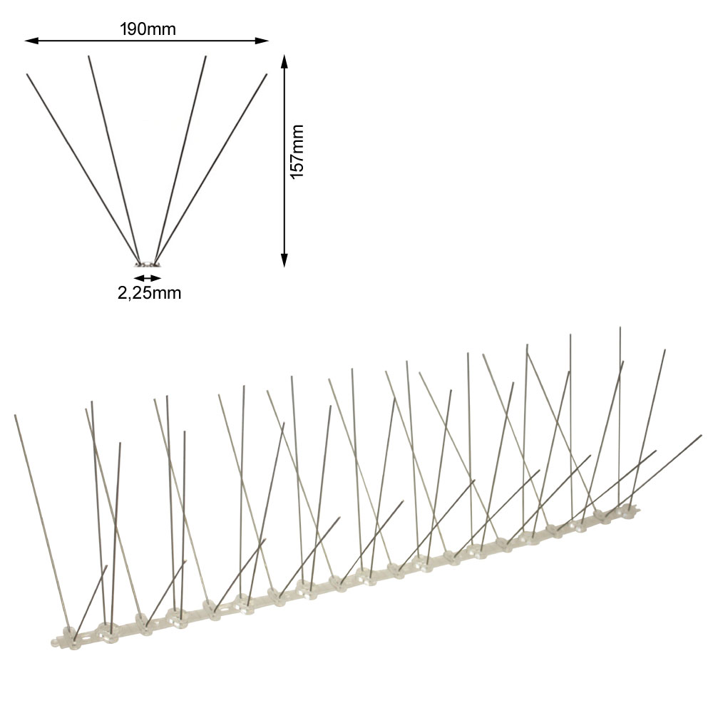 Pinchos para la protección de superficies frente a las gaviotas de 19cm de anchura y con una mayor altura de la púa de 15,7cm. Tiras de 50cm de longitud. La base es de policarbonato protegido contra la luz ultravioleta y las púas de acero inoxidable con la punta roma. Los pinchos se pueden instalar en cualquier tipo de superficie mediante una silicona adecuada. La base es plana en su parte inferior para facilitar la aplicación de la silicona, tiene líneas de fragmentación que permiten recortar fácilmente la longitud del pincho y agujeros para el montaje mediante tornillos.