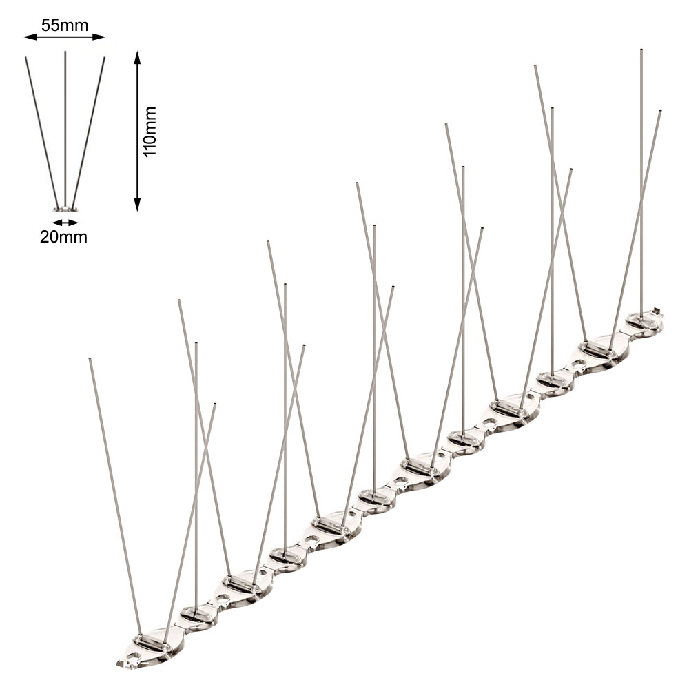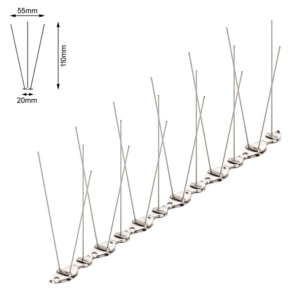Pinchos para la protección de superficies frente a las palomas de 5,5cm de anchura y en tiras de 31cm de longitud. La base es de policarbonato protegido contra la luz ultravioleta y las púas de acero inoxidable con la punta roma. Los pinchos se pueden instalar en cualquier tipo de superficie mediante una silicona adecuada. La base es plana en su parte inferior para facilitar la aplicación de la silicona, tiene líneas de fragmentación que permiten recortar fácilmente la longitud del pincho y agujeros para el montaje mediante tornillos.