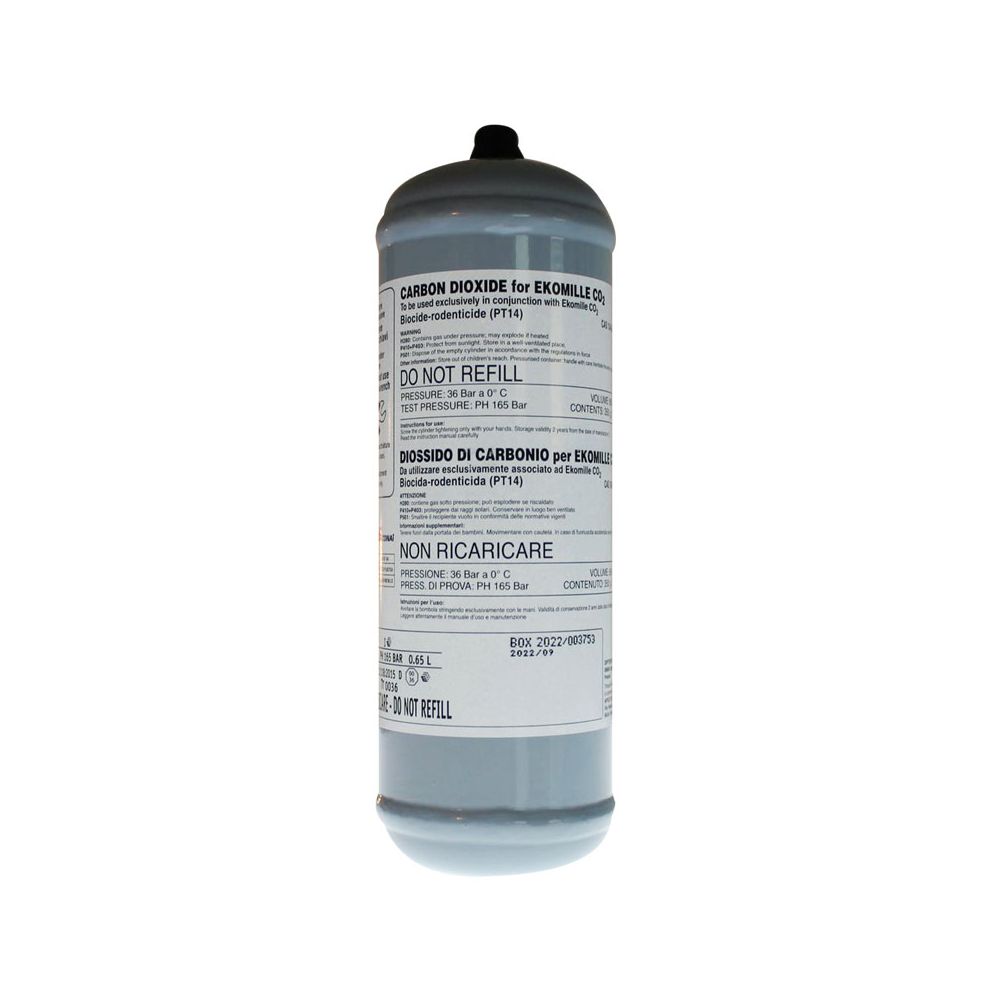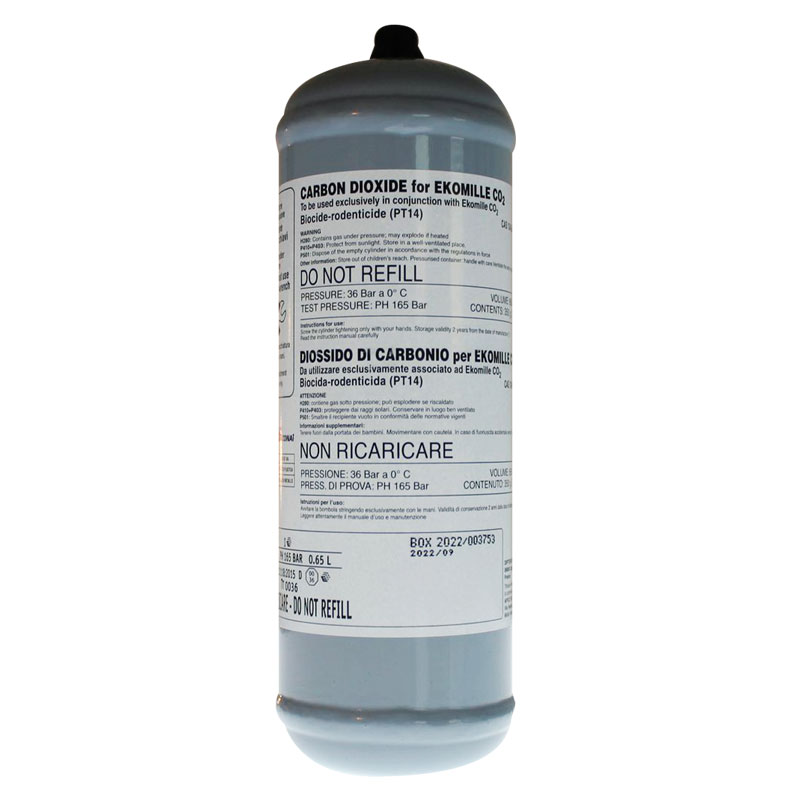 Cilindro de dióxido de carbono para el dispositivo Ekomille CO2. Con una capacidad de 350g de CO2 permite hasta 10 capturas por botella.