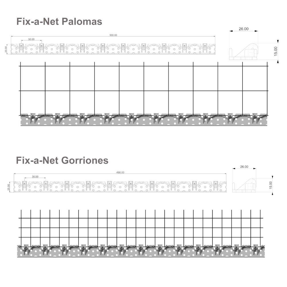 Dos versiones disponibles, para redes de palomas de 50mm y para redes de gorriones de 19mm. Se necesitan esquinas para los laterales que son compatibles para ambas versiones.