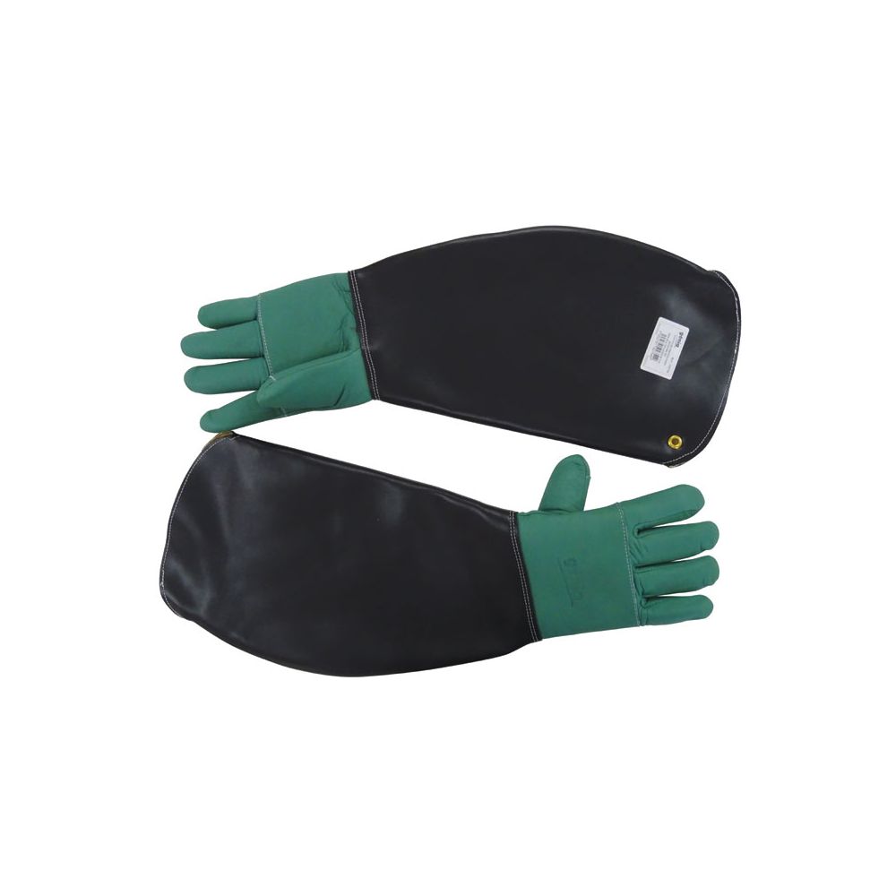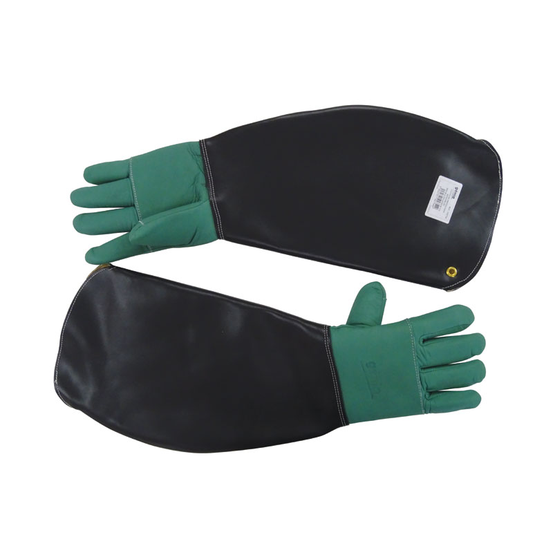 Guantes de protección reforzados para la captura de animales. Mano de cuero grueso flor de bovino hidrófugo, palma y parte superior reforzadas, guantes interior de lana aluminizada. Manguito de cuero pigmentado de 40cm, con forro de flor de bovino cromo, ojete de lona. Codo abierto para mayor comodidad.