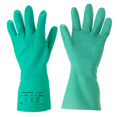 Guantes Ansell de nitrilo resistentes a disolventes, necesarios a la hora de manejar productos concentrados y cuando se manejan y pulverizan las lacas. Muy fuertes pero a la vez flexibles y cómodos de usar.