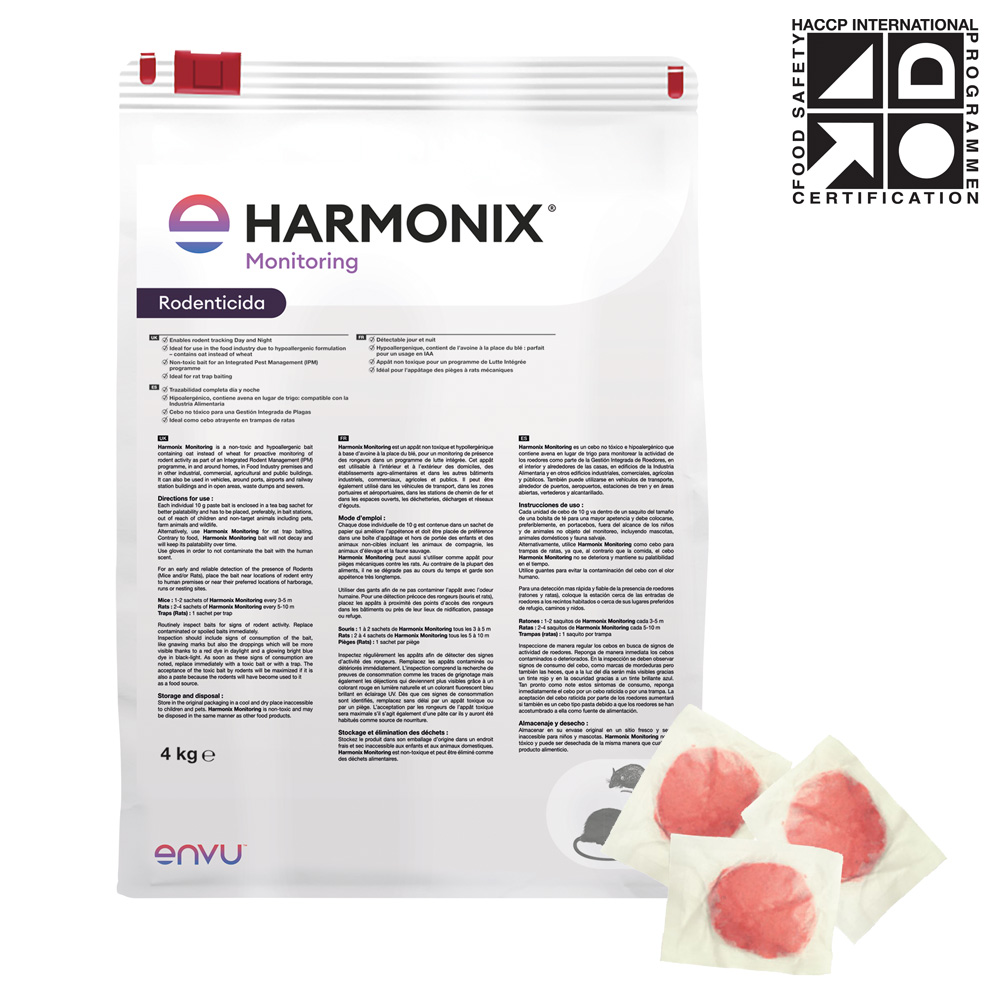 Cebo de monitoreo en pasta para ratas y ratones sin ingrediente activo. Indicado especialmente para la industria alimentaria y otras zonas sensibles. Hipoalergénico, contiene avena en lugar de trigo para monitorear la actividad de los roedores. Palatabilidad sin igual que se mantiene en el tiempo. En caso de detectarse actividad de roedores, si se sustituye con el cebo rodenticida Harmonix® Pasta, éstos no notarán el cambio, facilitando la ingesta y su control.