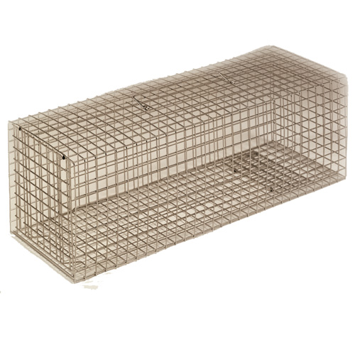 Trampa para conejos de captura única de acero cincado, robusta y efectiva.