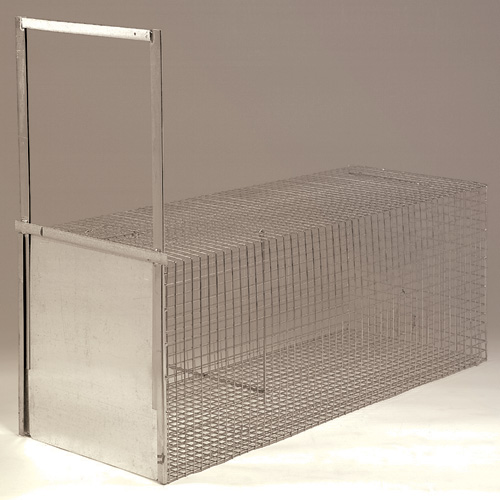 Una trampa robusta para atrapar perros o zorros. Sistema eficiente de cerramiento de trampilla vertical deslizante que asegura que el animal no pueda escapar. Fabricada de malla de acero cincado de 25 x 25mm y 2,6mm de diámetro.