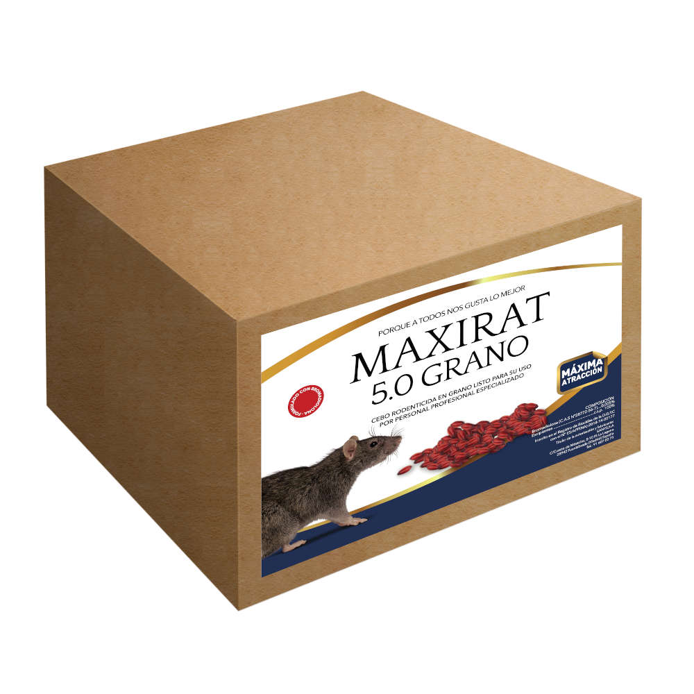 Cebo en base a bromadiolona al 0,005% presentado en cajas de 20kg conteniendo bolsitas de 50 gramos.