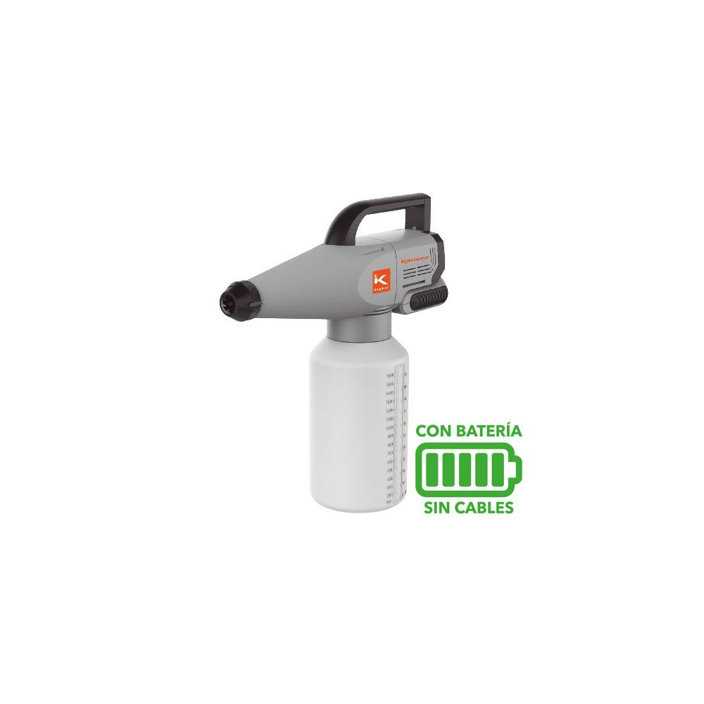 Nebulizador portátil y manejable con batería de litio. Genera una fina niebla. La batería es intercambiable, lo que permite una mayor autonomía. Para uso con productos en base a agua.