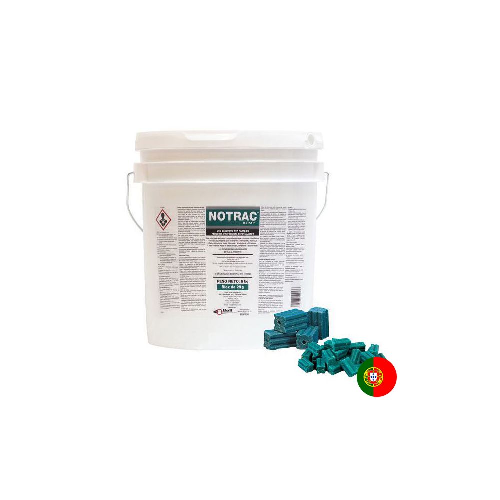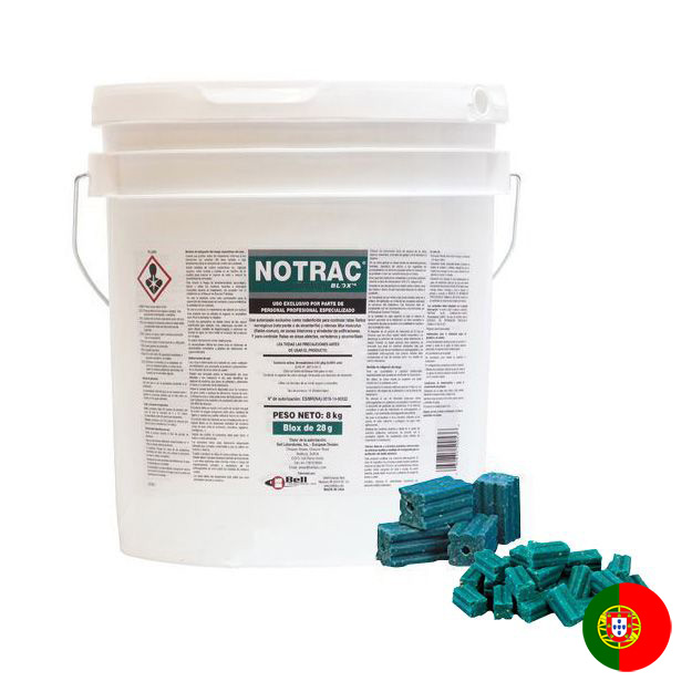 Bloco de extrusão baseado em bromadiolona a 0,005%, de baixo teor de cera e contendo uma mistura de 15 a 20 ingredientes alimentares que tornam apetente a ambos, ratos e ratazanas. Os blocos Notrac têm um desenho patenteado de várias arestas que dão ao roedor mais área para morder. Vem em blocos de 5 e 28 gramas, o último tem um orifício no centro para pendurar com fio ou fixado nas caixas de isco.