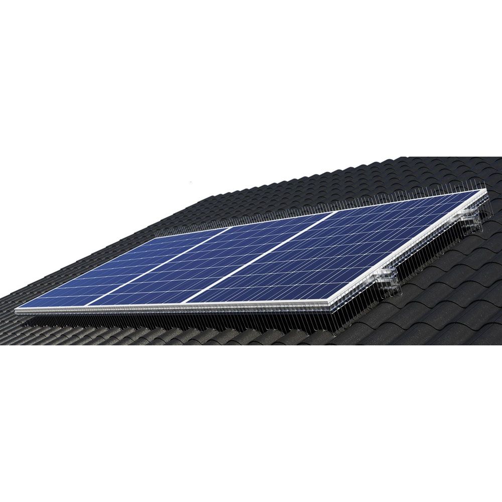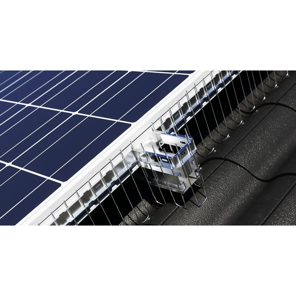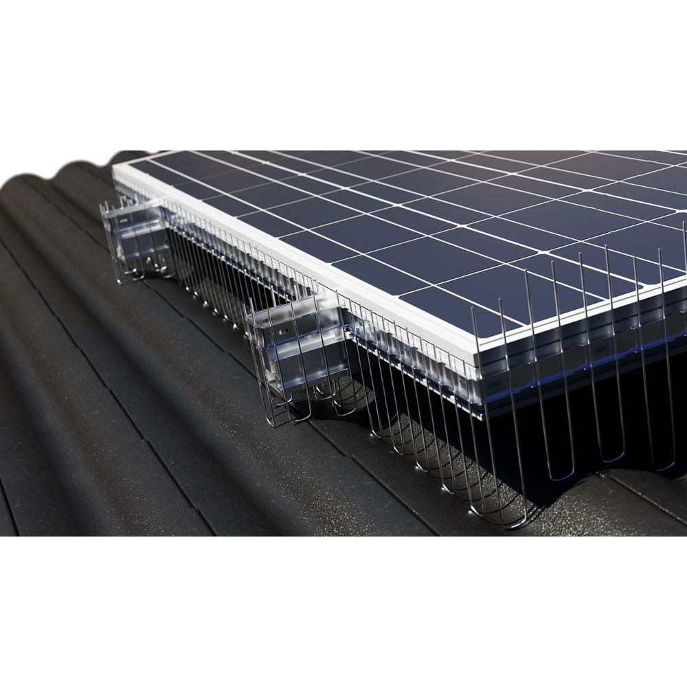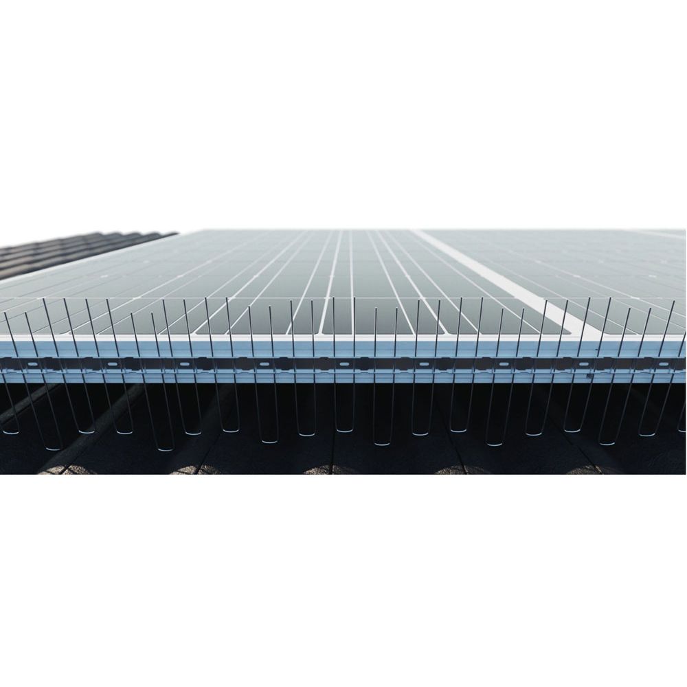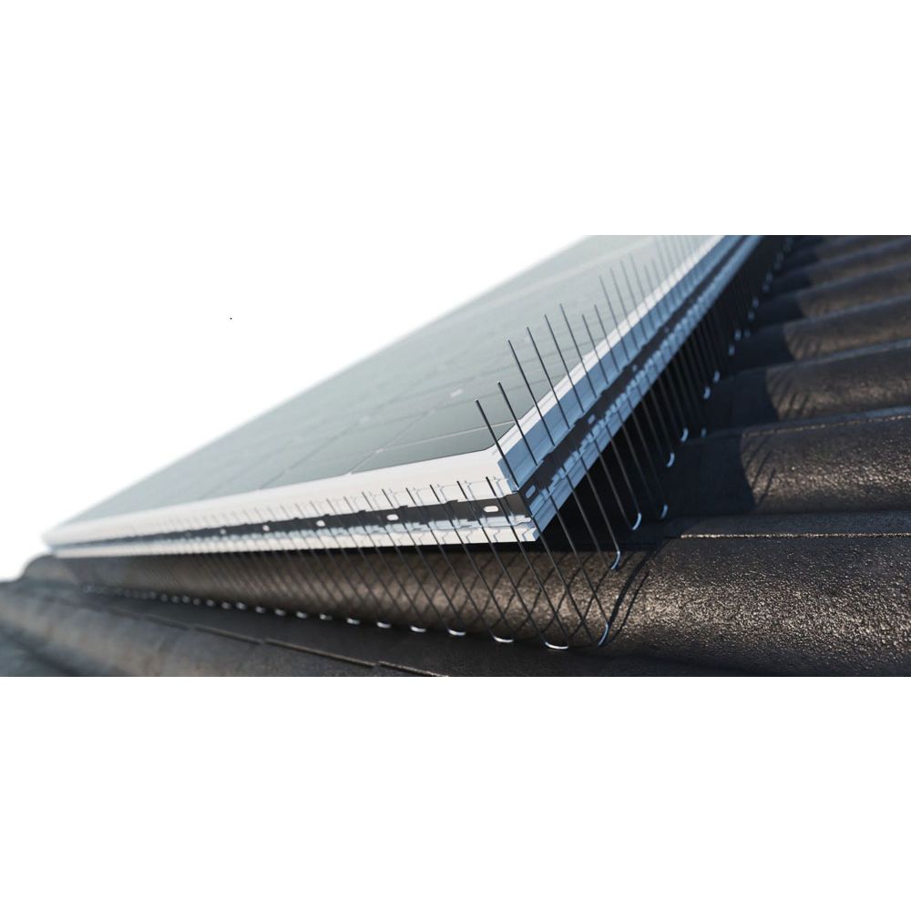 Pinchos de altura regulable para la protección de placas solares. Evitan el anidamiento de las palomas bajo éstas. Púas y base de acero inoxidable. Para la protección de un hueco máximo entre placa y tejado de 16cm. Base de fijación metálica de 18mm de ancho y en tiras de 1m de longitud. Se puede fijar mediante silicona o atornillado. Las púas tienen una separación de 25mm y un grosor de 2mm con punta roma. Para una protección rápida y efectiva incluso en las superficies más irregulares.