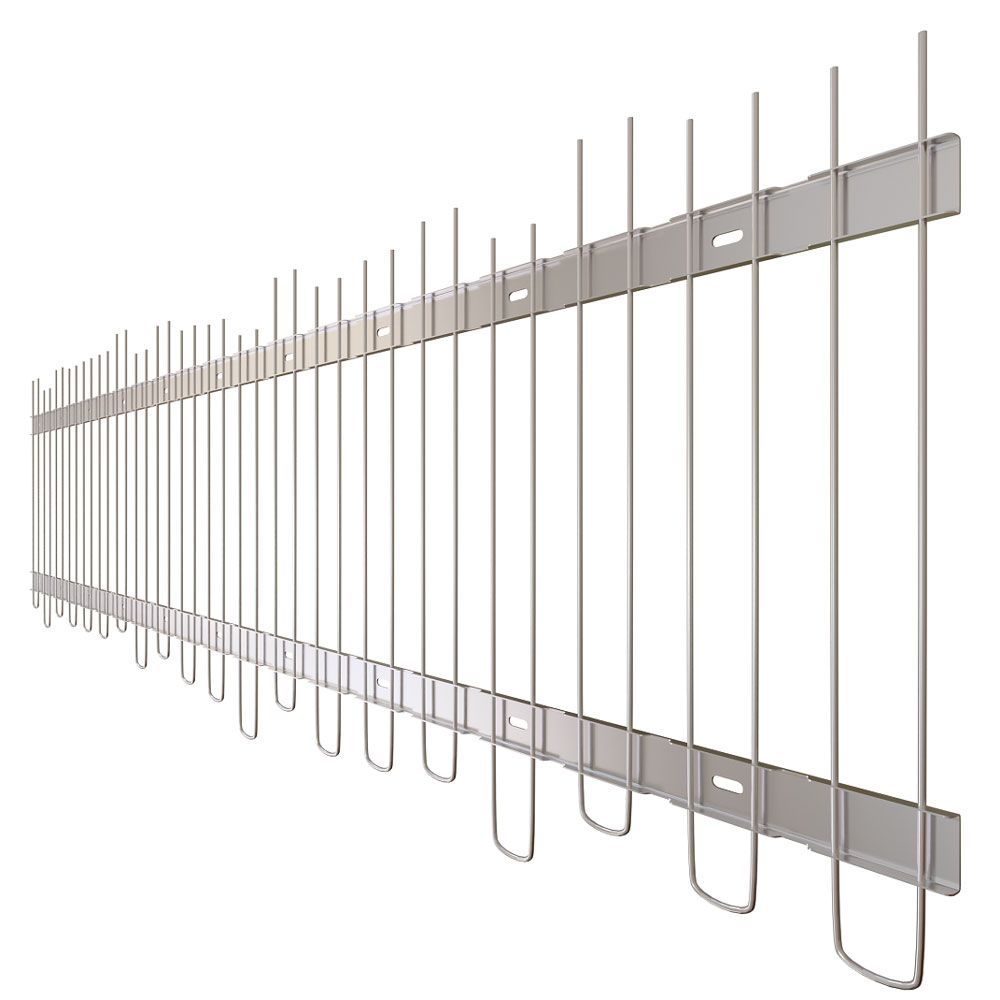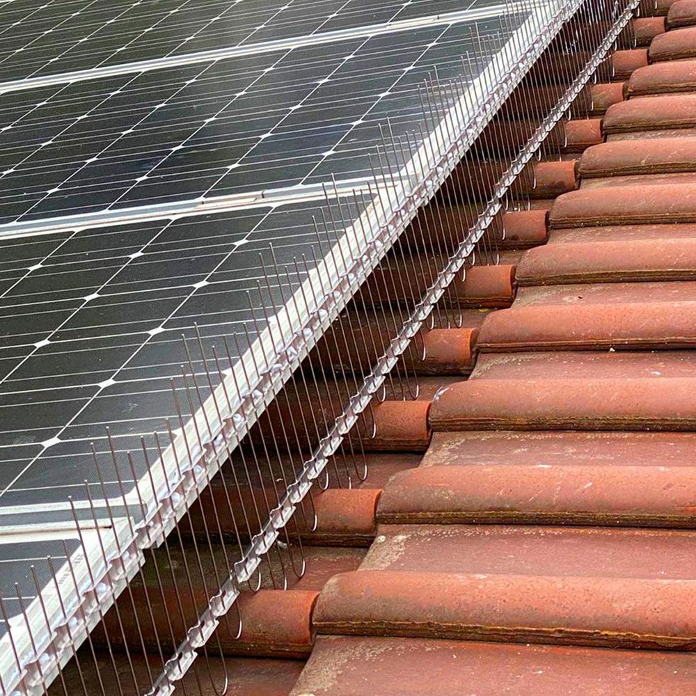 Pinchos de altura regulable para la protección de placas solares. Evitan el anidamiento de las palomas bajo éstas. Púas y base de acero inoxidable. Para la protección de un hueco máximo entre placa y tejado de 21cm. Base de fijación metálica doble de 18mm de ancho y en tiras de 1m de longitud. Se puede fijar mediante silicona o atornillado. Las púas tienen una separación de 25mm y un grosor de 2mm con punta roma. Para una protección rápida y efectiva incluso en las superficies más irregulares.