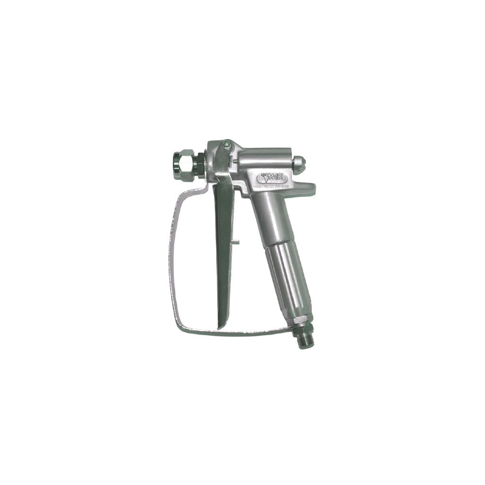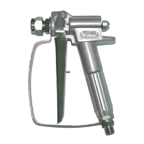 Pistola inyectora y pulverización de alta presión para bombas Mabi. Adecuada para productos líquidos y en gel. Cuerpo de aluminio. Filtro incluido. Acoplamiento giratorio de rosca de 1/4" para la conexión de la manguera. La rosca para las boquillas (no incluidas) es de 11/16”.