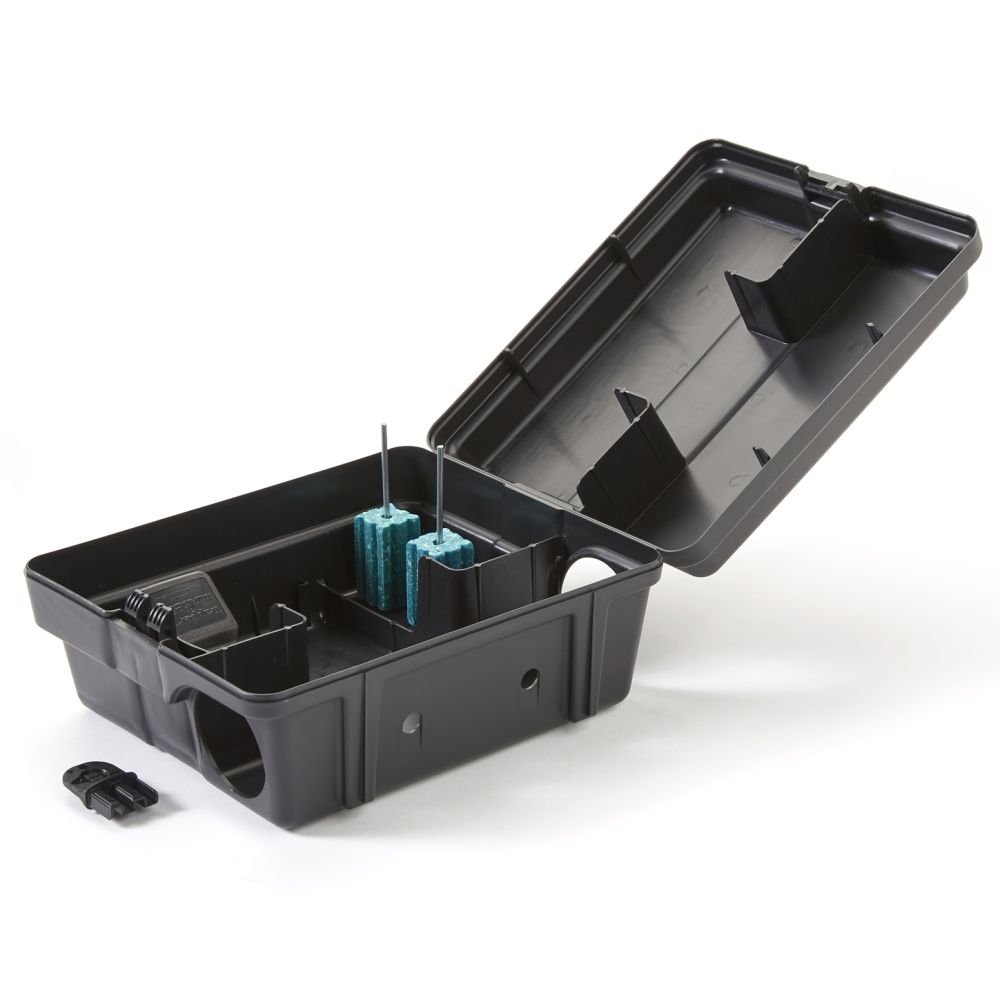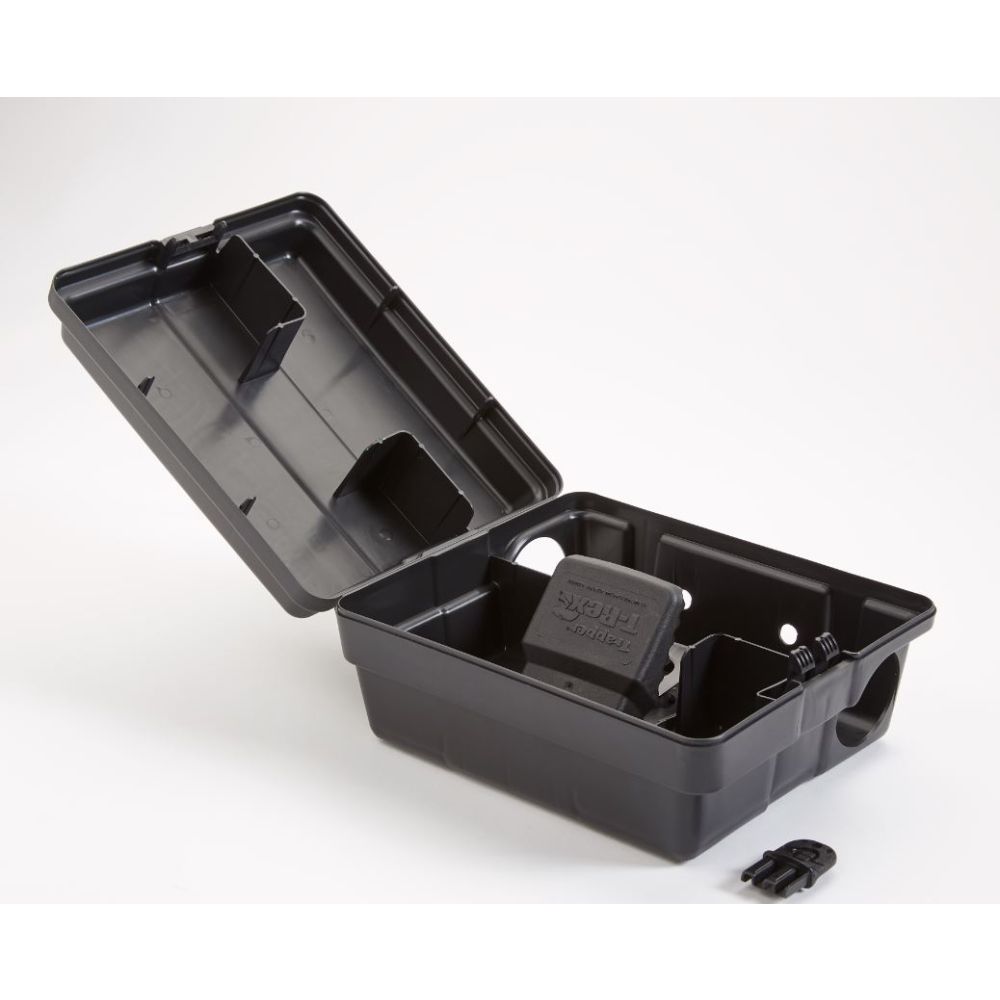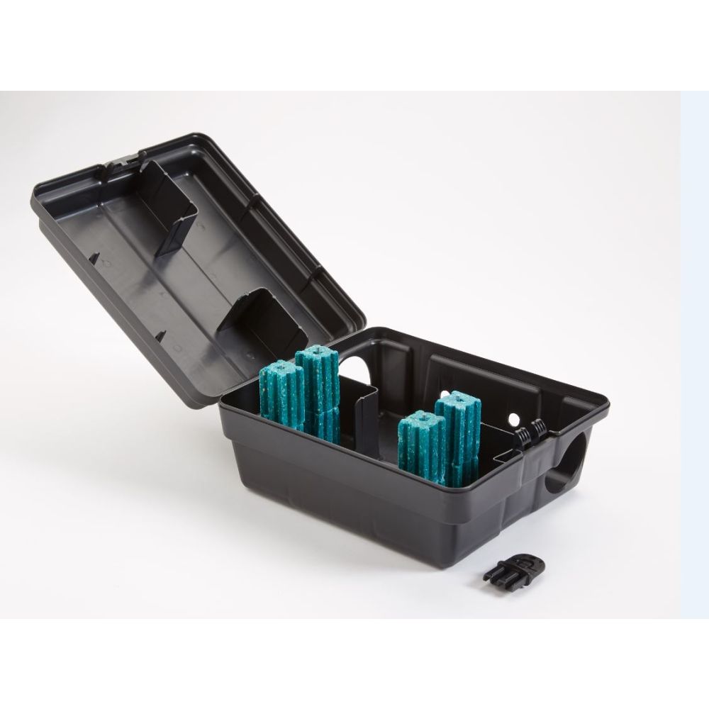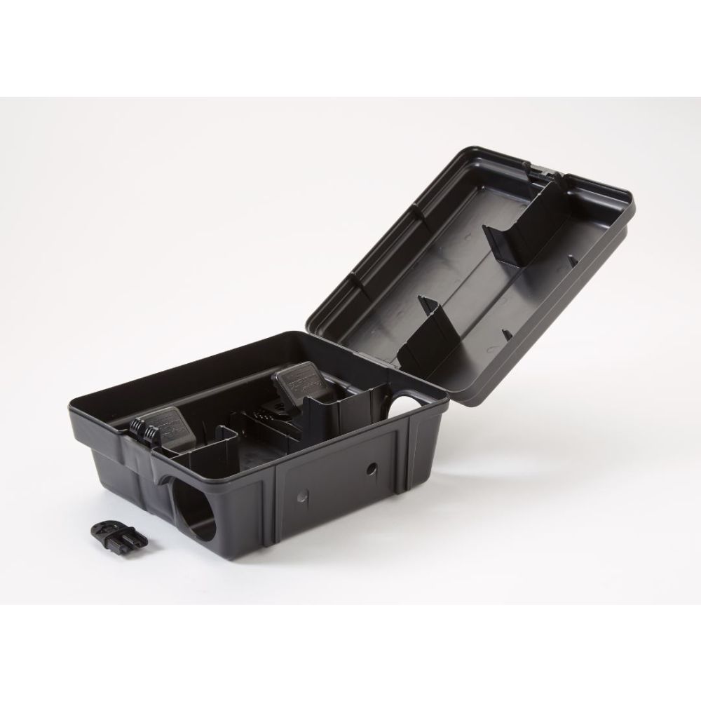 Caja portacebos para ratas fabricada de plástico moldeado por inyección, es durable y resistente a impactos y temperaturas extremas. A pesar de su tamaño reducido, que permite que quepa en sitios estrechos, permite colocar varios bloques de cebo o un cepo para ratas Trapper® T-Rex o Big Snap-E, o dos cepos para ratones Trapper® Mini-Rex. Incluye varillas metálicas y etiquetas.
