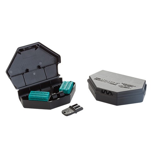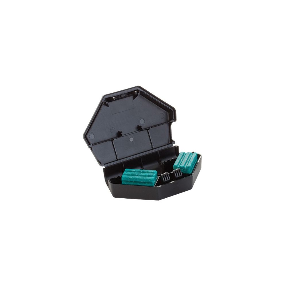 Caja portacebos de seguridad para ratones compacta, pero de gran capacidad. Admite hasta 2 bloques de 28 gramos o cebo en pasta. Con varillas internas metálicas para la fijación del cebo en pasta para una mayor seguridad. La caja puede colocarse estratégicamente tanto a lo largo de la pared como en las esquinas gracias a su diseño en ángulos.
