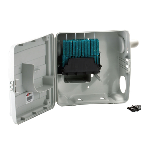 Caja portacebos para ratas de color gris que simula una caja eléctrica, fabricada en plástico 100% reciclado de alta calidad inyectado en molde. Con cierre de seguridad, inaccesible para niños y animales no diana como perros. Bandeja extraíble para mayor comodidad y facilidad de limpieza. Puede albergar cepos de captura. Con varillas metálicas y etiquetas, y sistema integrado de código de barras.