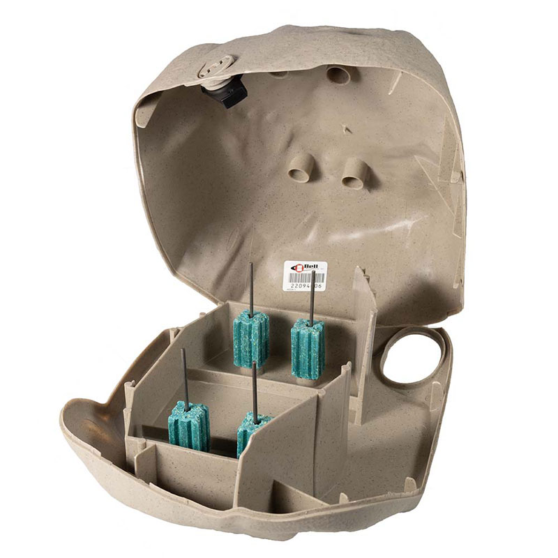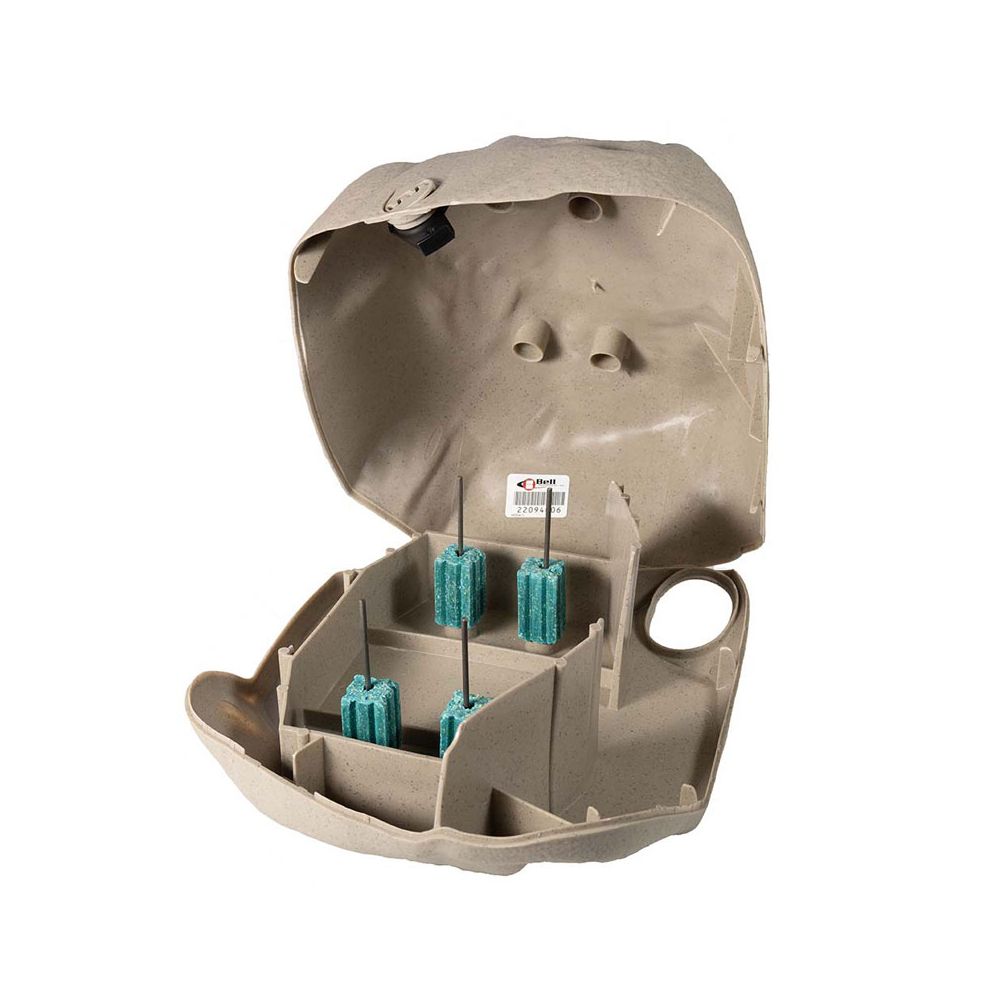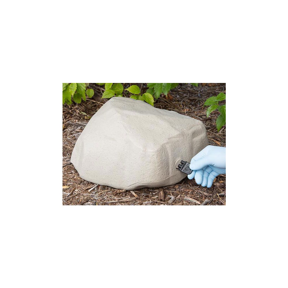 Caja portacebos para ratas que simula una piedra, fabricada de plástico moldeado por inyección. Ideal para ser camuflada en exteriores y especialmente en jardines. Textura natural para lograr un aspecto realista. Orificios ocultos para entrada de roedores. Cierre de seguridad mediante llave. Diseño de apertura lateral para servicio de mantenimiento más rápido. Con soporte incorporado para tarjetas de registro de servicio. Pieza desprendible en el fondo de la caja como opción de fijación.