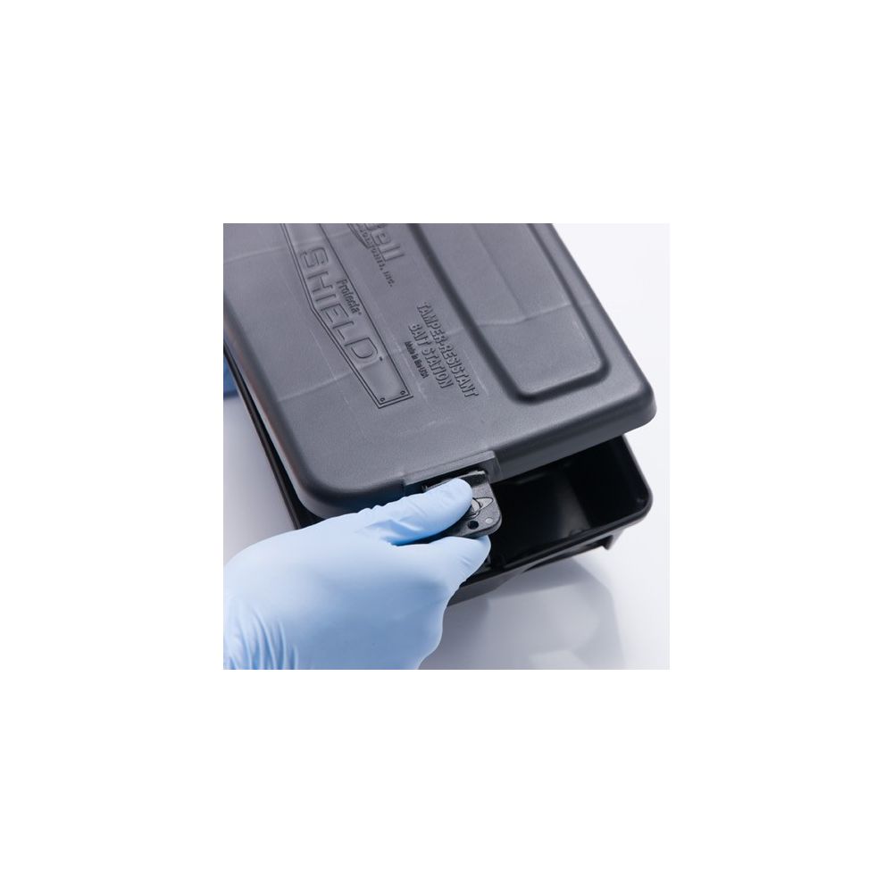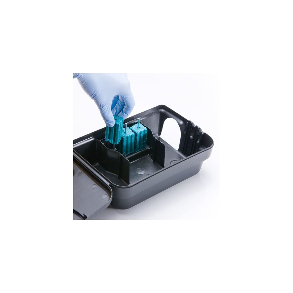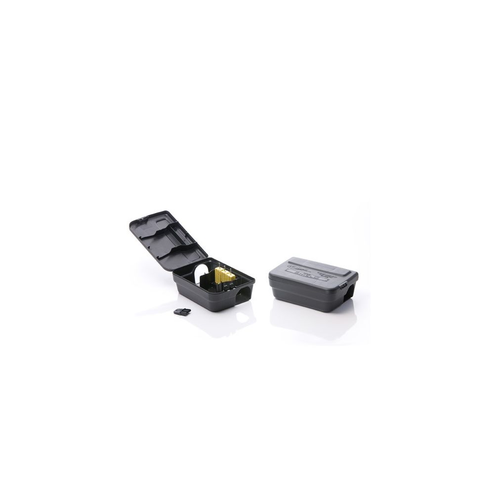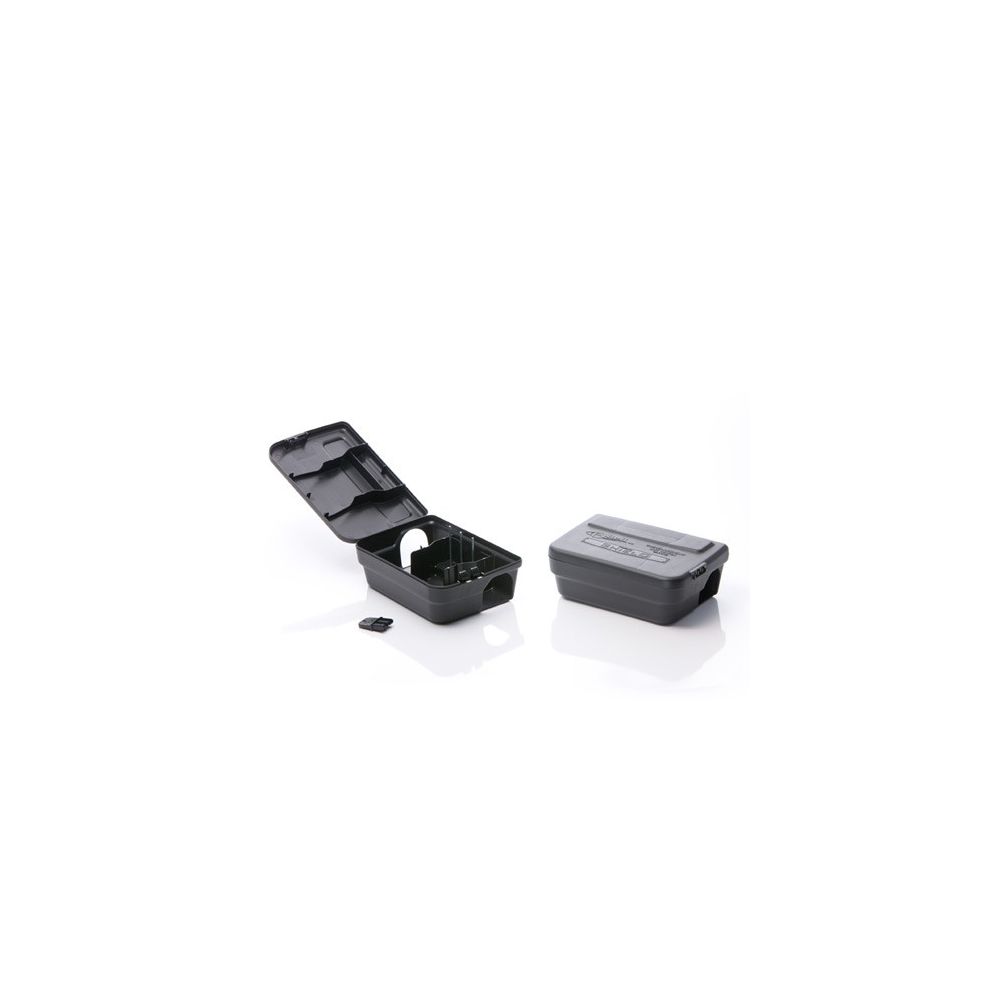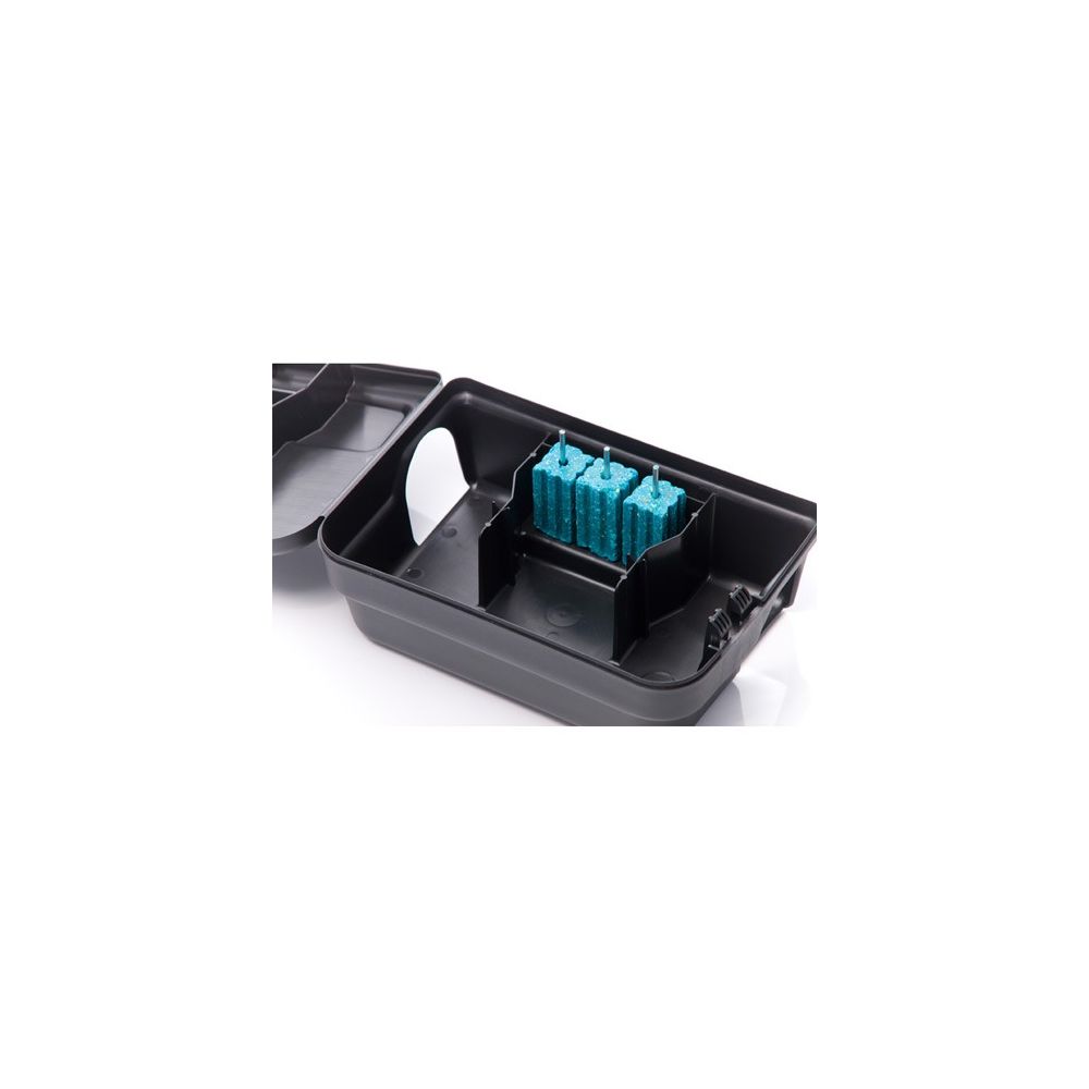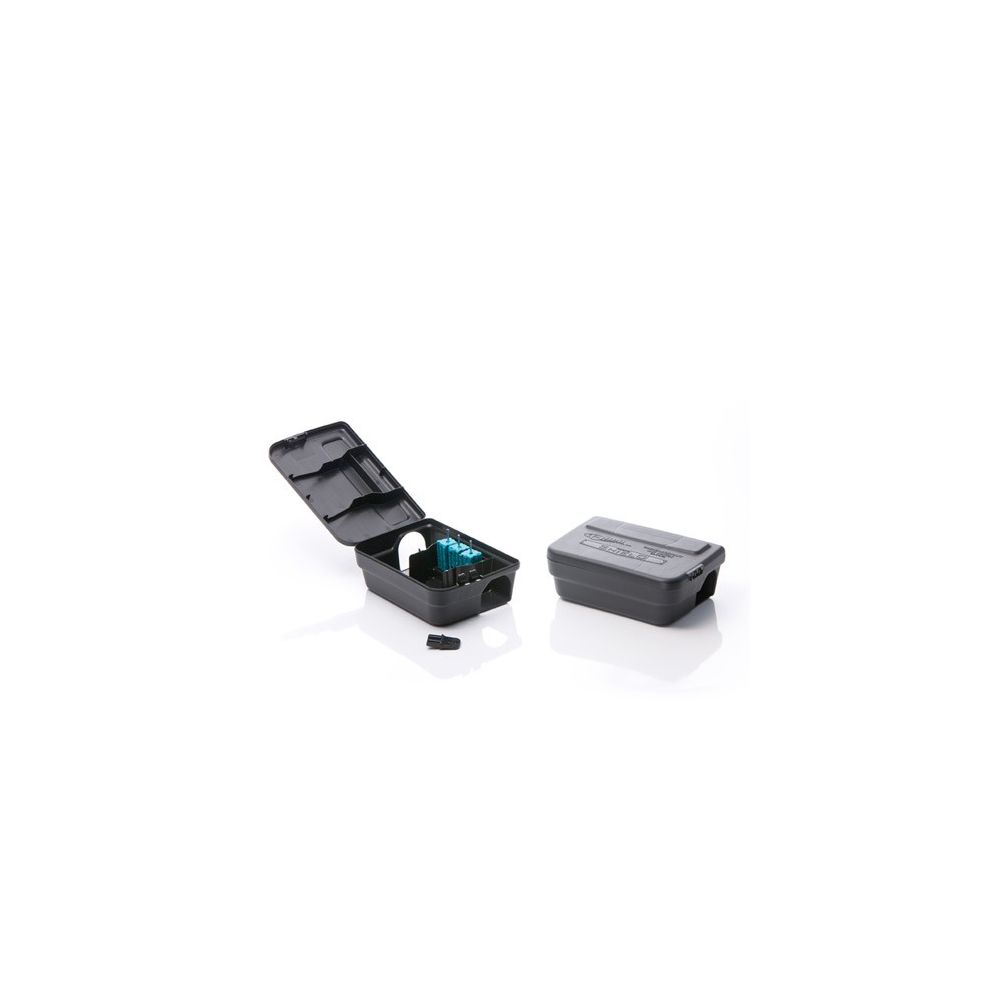 Caja portacebos compacta para ratas que se adapta a cualquier ubicación, fabricada en plástico de alta resistente a altas temperaturas. Puede albergar hasta 3 bloques de cebo de 28g o pasta fresca. Mecanismo de un solo cierre y apertura lateral para un servicio más rápido y cómodo. Paredes interiores redondeadas para facilitar la limpieza. Las varillas de metal no se salen durante la limpieza.