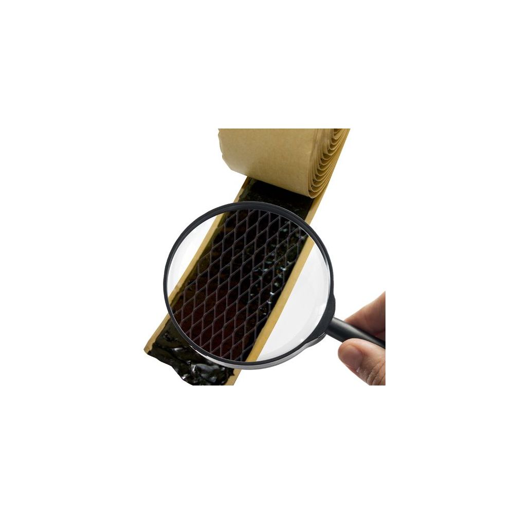 Cinta de sellado altamente resistente frente a ratas y ratones. Compuesta de una malla metálica de alta densidad reforzada de acero inoxidable entre dos gruesas capas adhesivas de butilo. Altamente moldeable y flexible para el sellado de agujeros y grietas en edificaciones. Gran durabilidad. Extremadamente rápido de colocar, cortar la longitud necesaria y poner encima del orificio a tapar. Se adhiere a la gran mayoría de superficies y puede pintarse encima.