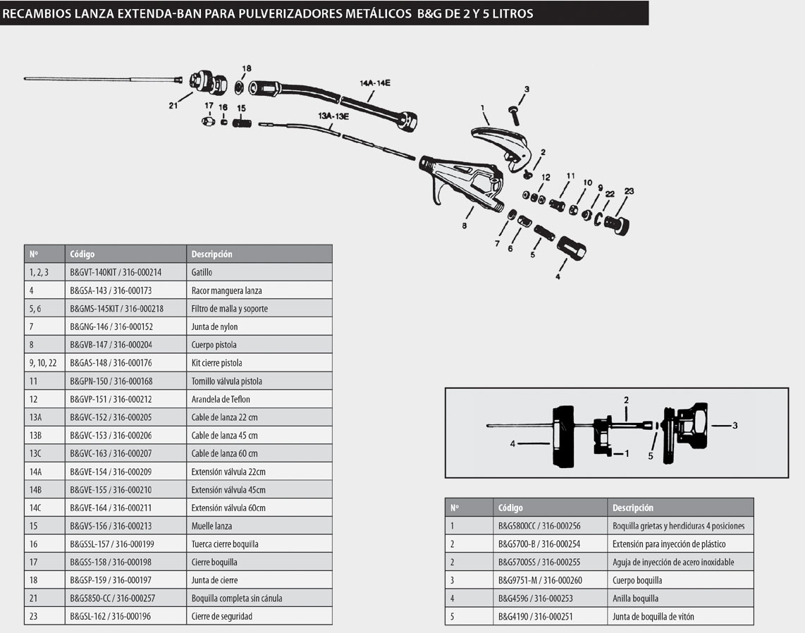 Despiece de los recambios más habituales para la lanza Extenda-Ban para los pulverizadores B&G metálicos de 2 y 5 litros. CONTRA PEDIDO (en algunas de las piezas)