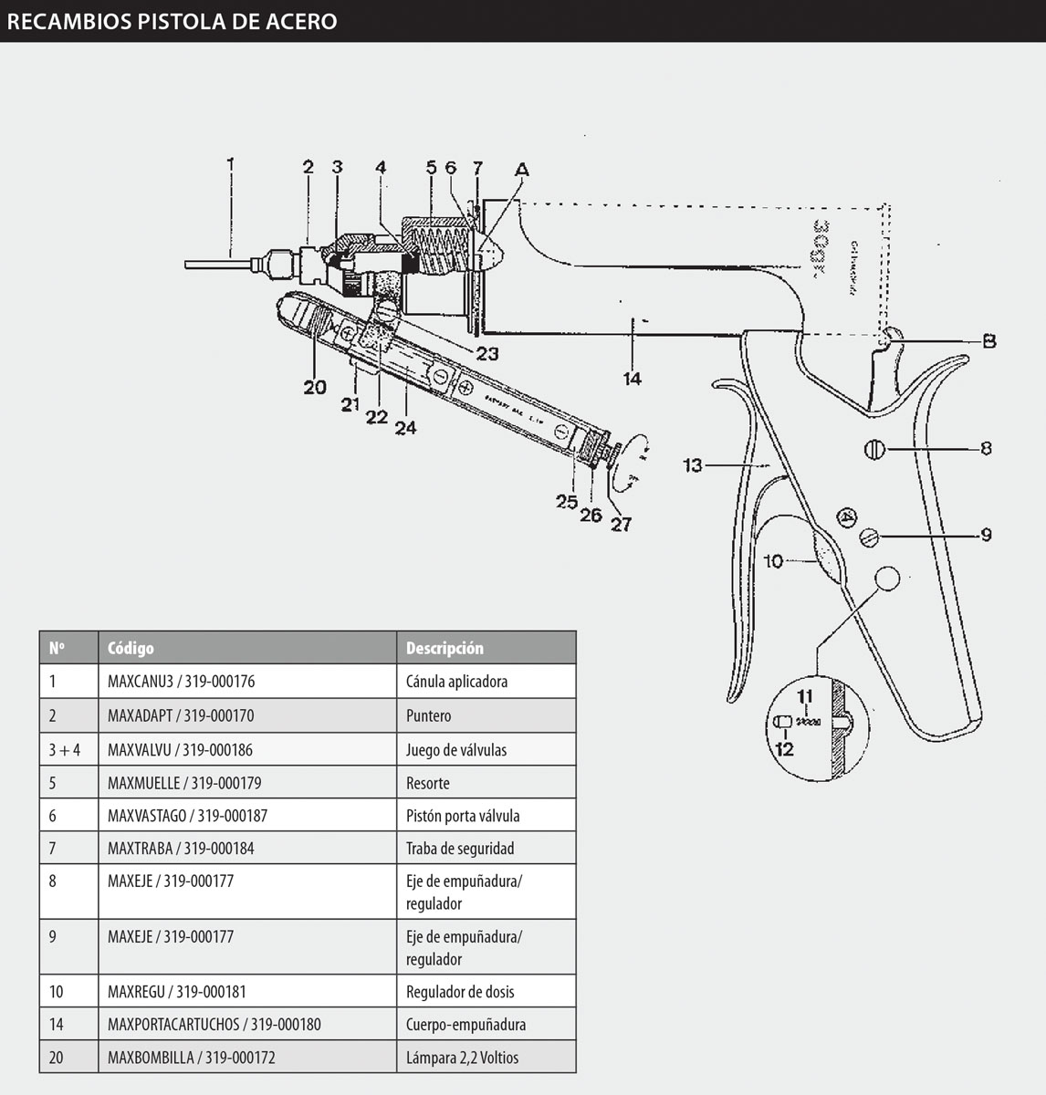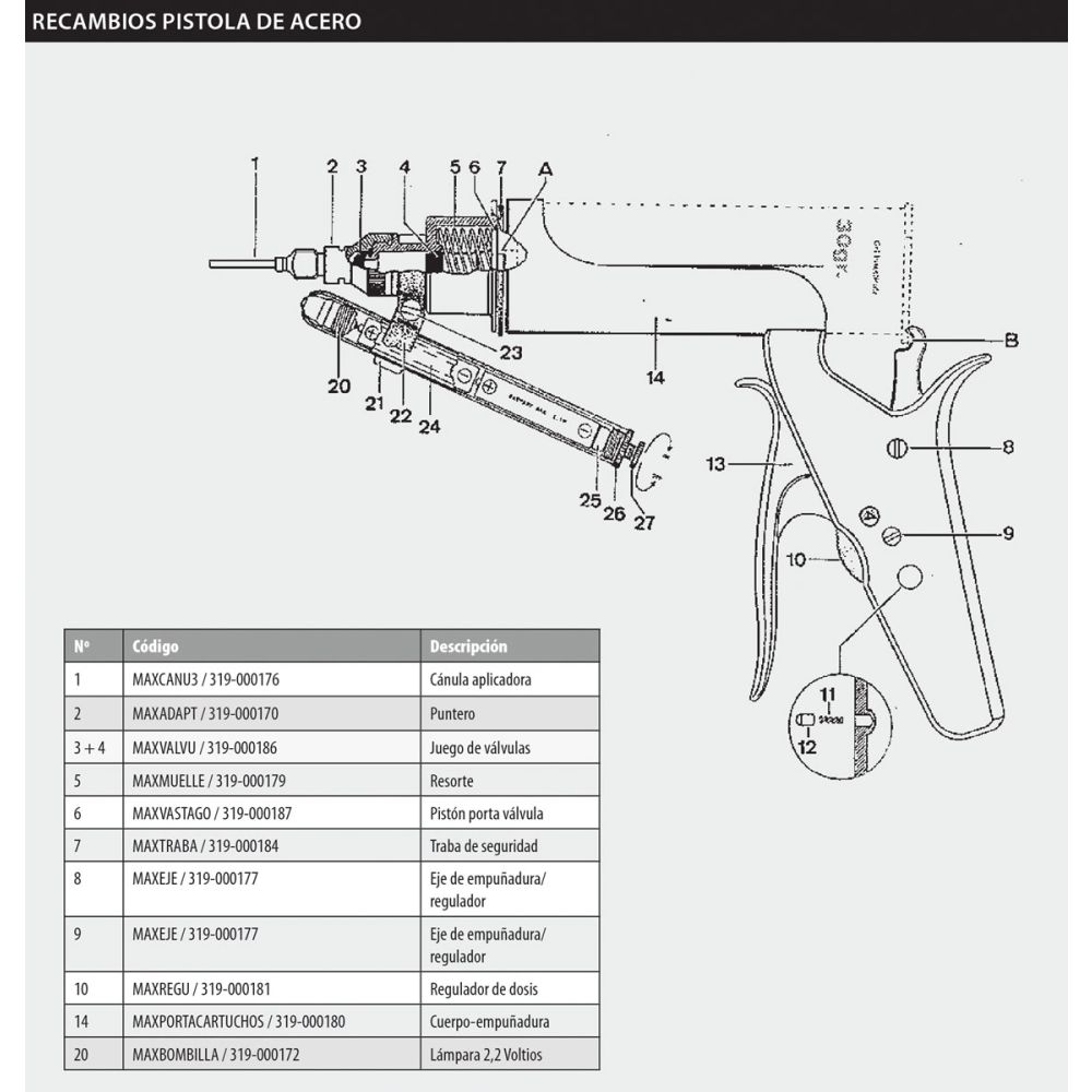Despiece de los recambios más habituales para la Pistola Walmur de acero para geles. CONTRA PEDIDO (en algunas de las piezas)
