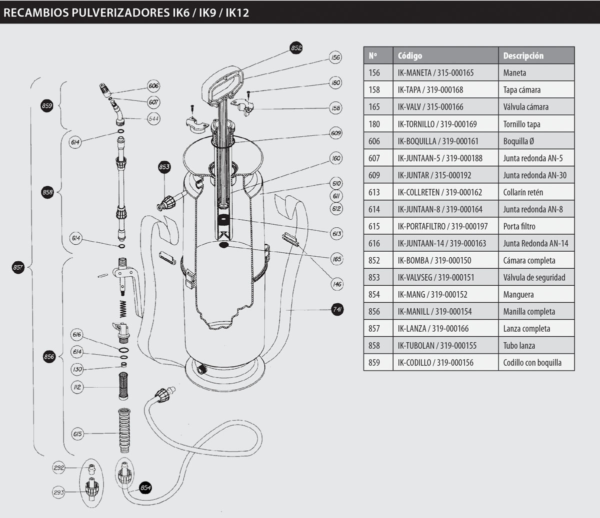 Despiece de los recambios más habituales para los pulverizadores IK6, IK9 y IK12 Multi. CONTRA PEDIDO (en algunas de las piezas)