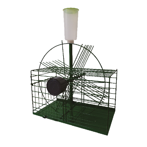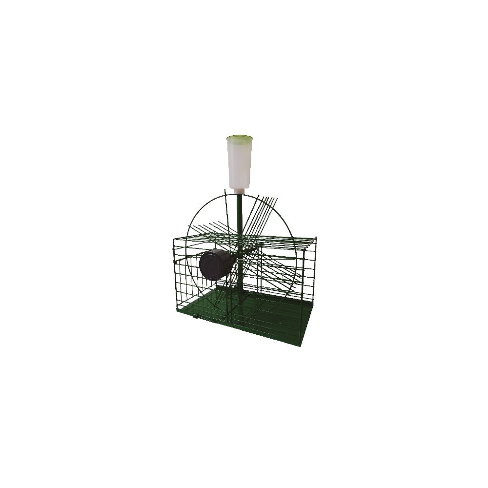 Para la captura de palomas mediante un sistema giratorio de entrada que empuja las palomas hacia el interior de la jaula, sirve comida de cebo y se mantiene en espera hasta la llegada de la siguiente presa. Funcionamiento mecánico altamente fiable que permite 50 capturas, no requiere de electricidad y es resistente a las inclemencias meteorológicas. Con sistema antiretorno para evitar que las palomas intenten escapar. El sistema de entrada se puede adaptar a cualquier tipo de jaula.