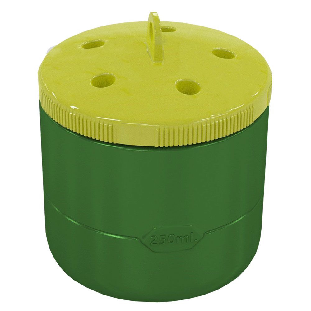 Trampa reutilizable para la detección de las plagas de moscas de la fruta/vinagre (Drosophila spp.). Se emplea con un líquido atrayentes específico (250ml). Diseño compacto y elegante para uso en hogares, especialmente en cocinas, así como en locales comerciales e industriales tales como restaurantes, panaderías, pastelerías y ubicaciones similares. Las moscas de la fruta entran por los agujeros superiores y ya no pueden escapar.