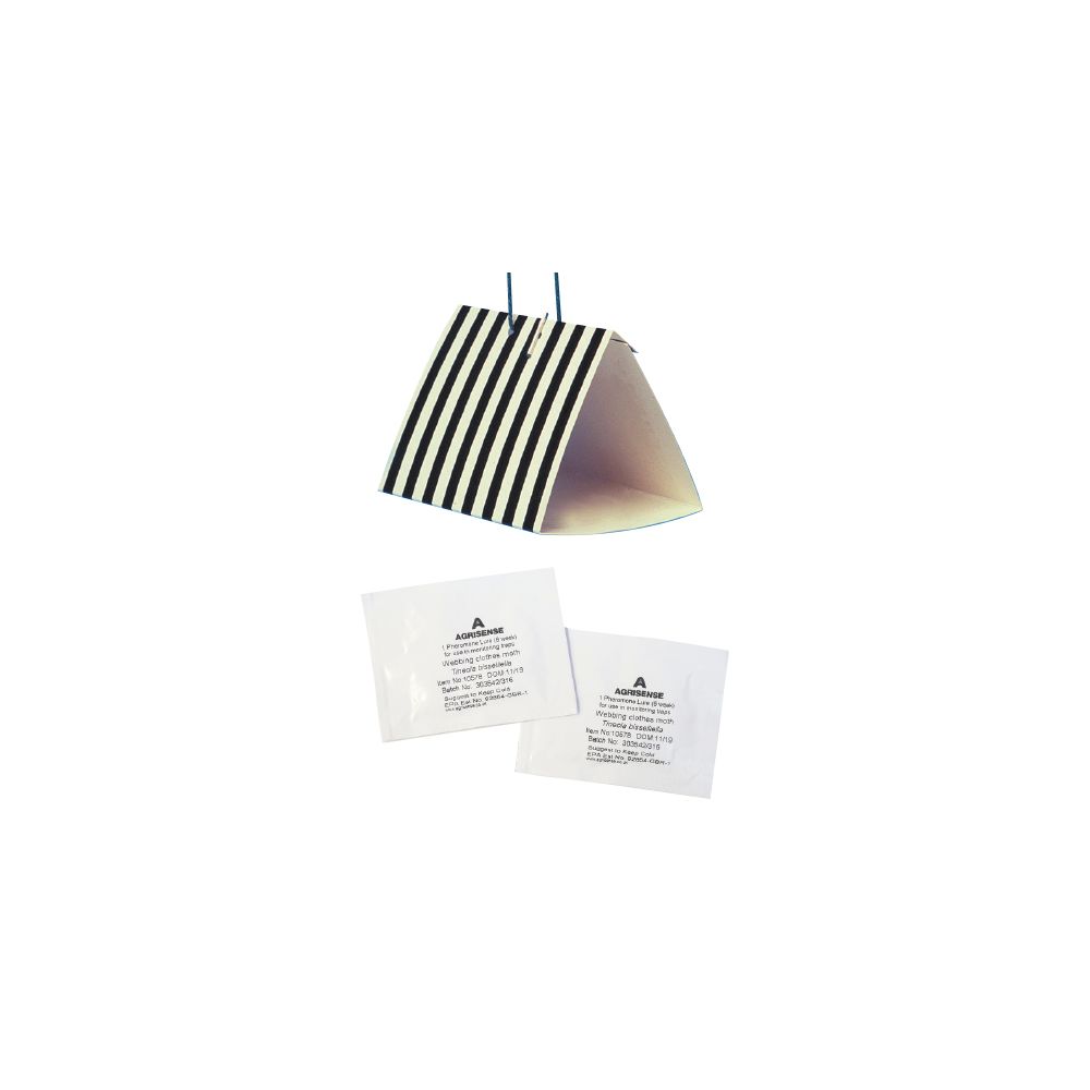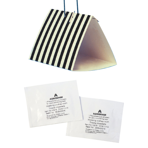 Trampas de cartón adhesivo para la detección y monitorización de la palomilla de la ropa Tineola bisselliella. Imprescindible para la detección precoz de infestaciones de esta plaga. La duración de la feromona es de 12 semanas. Las trampas no incluyen el atrayente.