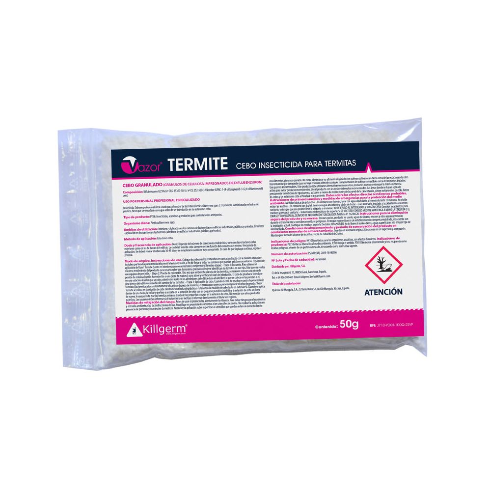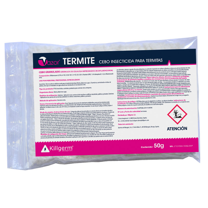 Vazor® Termite es un sistema completo para el control eficiente y eficaz de las colonias de termitas subterráneas mediante el uso de un cebo alimenticio impregnado con el ingrediente activo diflubenzuron. Una vez las termitas ingieren el cebo de gran apetencia y atracción, aprovechando su propia biología, transfieren el producto a la colonia hasta lograr un control total.