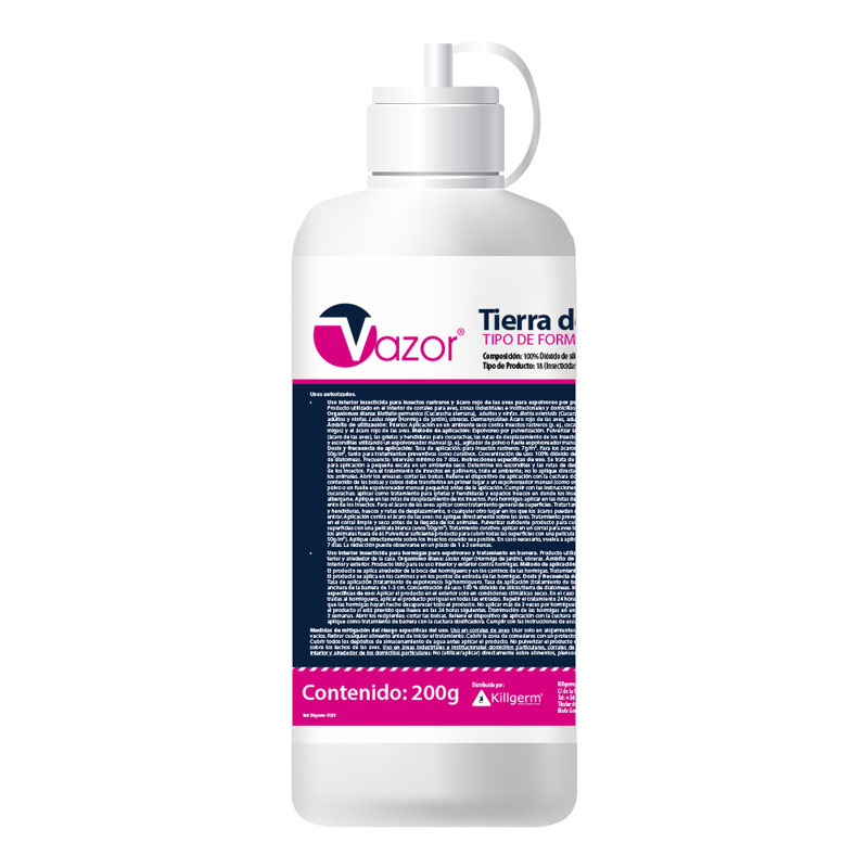 Polvo insecticida para espolvoreo a base de dióxido de silicio (tierra de diatomeas). Actúa en la capa exterior superficial de la cutícula del insecto, la capa de cera exterior protectora se daña mecánicamente y el insecto muere por deshidratación.