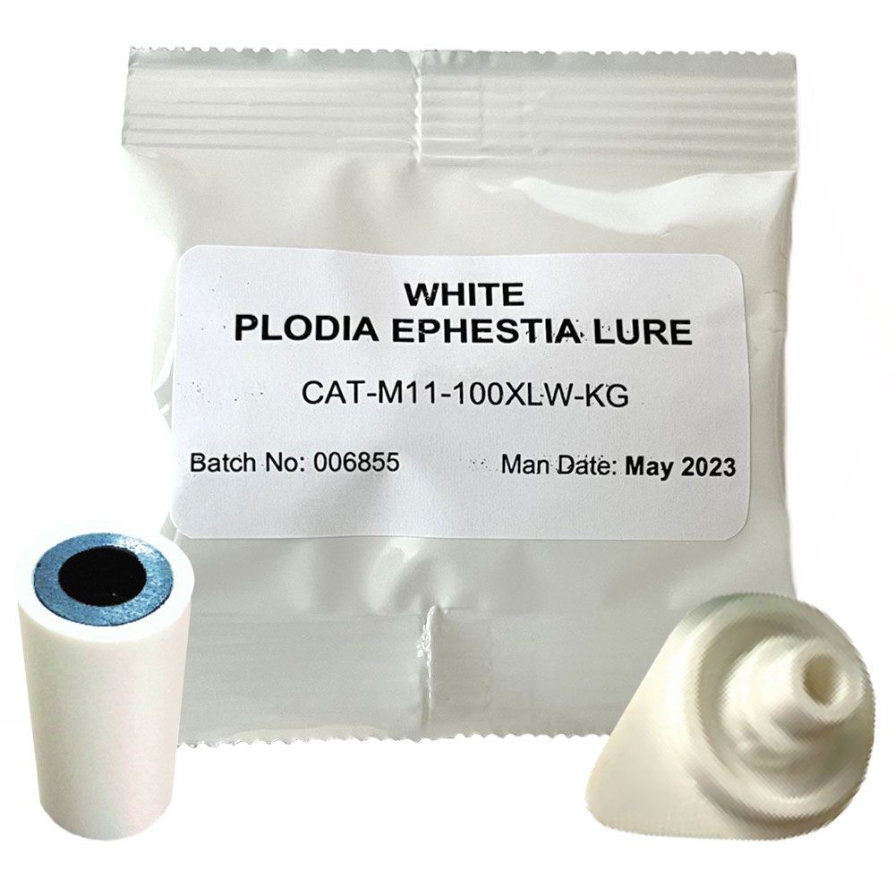 Dispensadores de feromonas para las palomillas de la harina Plodia interpunctella, Ephestia kuehniella, Ephestia cautella y Ephestia elutella. Para ser utilizados en trampas adhesivas u otro tipo de trampas. Los dispensadores para las palomillas de la harina constan de feromona impregnada en un vial de polietileno de cesión controlada de color blanco.