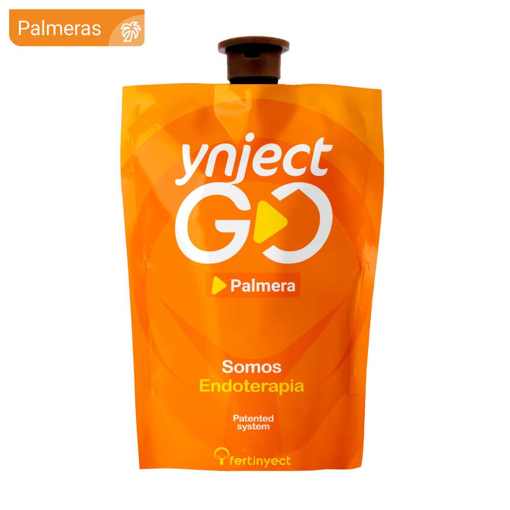 Sistema de Endoterapia Ynject GO para formulaciones fitosanitarias líquidas y sólidas frenta a las plagas de las palmeras. Máximo respeto a la fisiología de la planta mediante una baja presión, sin daños que comprometen su integridad estructural. Alto volumen para una distribución óptima y una rápida velocidad de absorción. El dispositivo se suministra autopresurizado con una mezcla vehiculizante para la inyección al tronco del producto fitosanitario. Efectividad y rapidez en cada tratamiento.
